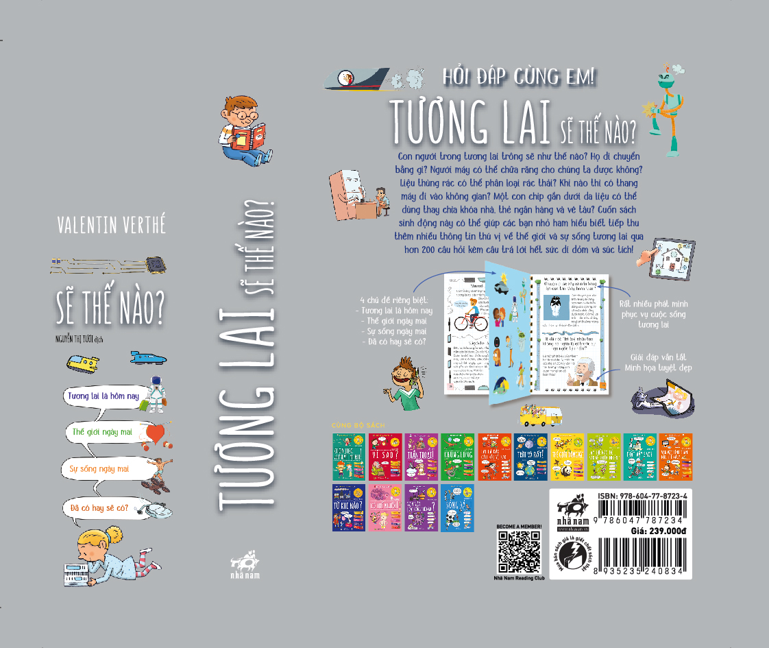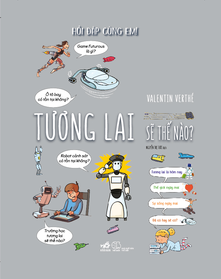 Con người trong tương lai trông sẽ như thế nào? Họ di chuyển bằng gì? Người máy có thể chữa răng cho chúng ta được không? Liệu thùng rác có thể phân loại rác thải? Khi nào thì có thang máy đi vào không gian? Một con chíp gắn dưới da liệu có thể dùng thay chìa khóa nhà, thẻ ngân hàng và vé tàu? Cuốn sách sinh động này có thể giúp các bạn nhỏ ham hiểu biết tiếp thu thêm nhiều thông tin thú vị về thế giới và sự sống tương lai qua hơn 200 câu hỏi kèm câu trả lời hết sức dí dỏm và súc tích!