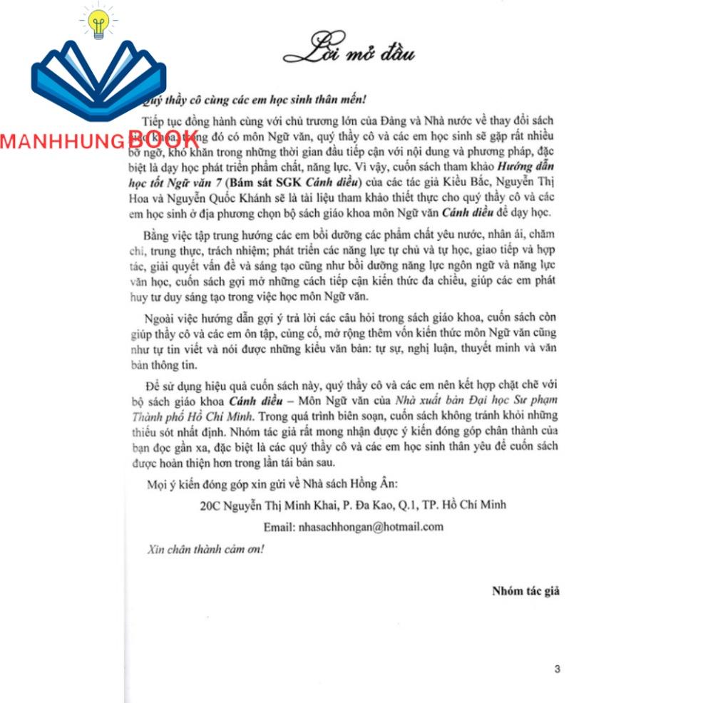 Tiếp tục đồng hành cùng với chủ trương lớn của Đảng và Nhà nước – thay đổi sách giáo khoa, trong đó có môn Ngữ văn, quý thầy cô và các em học sinh sẽ gặp rất nhiều bỡ ngỡ, khó khăn trong những thời gian đầu tiếp cận với nội dung và phương pháp, đặc biệt là dạy học phát triển phẩm chất, năng lực. Vì vậy, cuốn sách tham khảo Hướng Dẫn Học Tốt Ngữ Văn 7 (Bám Sát SGK Cánh Diều) của các tác giả Kiều Bắc, Nguyễn Thị Hoa và Nguyễn Quốc Khánh sẽ là tài liệu tham khảo thiết thực cho quý thầy cô và các em học sinh ở địa phương chọn bộ sách giáo khoa môn Ngữ văn Cánh diều để dạy học.