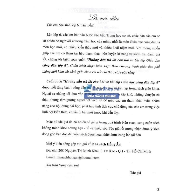 Cuốn sách Hướng Dẫn Trả Lời Câu Hỏi Và Bài Tập Giáo Dục Công Dân Lớp 6 được viết từng bài, hướng dẫn trả lời các câu hỏi và bài tập trong sách giáo khoa. Ngoài ra chúng tôi đưa vào sách những câu hỏi, bài tập khó, những chuyện có thật, những tấm gương người tốt việc tốt để giúp các em tham khảo mẫu, nhằm nâng cao nội dung bài học, phát huy tính tích cực chủ động của các em trong việc lĩnh hội kiến thức, chuẩn bị bài mới trước khi đến lớp.