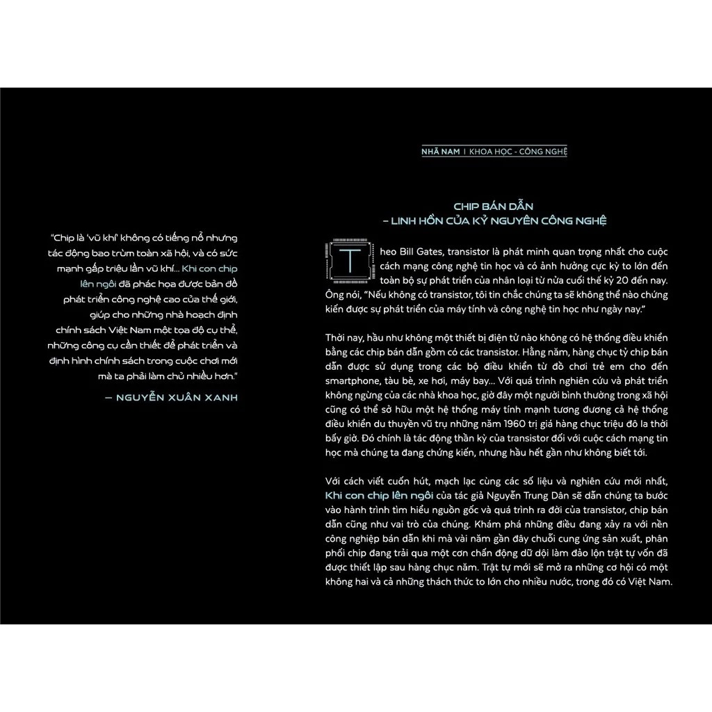 Với cách viết cuốn hút, mạch lạc cùng các số liệu và nghiên cứu mới nhất, Khi con chip lên ngôi của tác giả Nguyễn Trung Dân sẽ dẫn chúng ta bước vào hành trình tìm hiểu nguồn gốc và quá trình ra đời của transistor, chip bản dẫn cũng như vai trò của chúng. Khám phá những điều đang xảy ra với nền công nghiệp bán dẫn khi mà vài năm gần đây chuỗi cung ứng sản xuất, phân phối chip đang trải qua một cơn chấn động dữ dội làm đảo lộn trật tự vốn đã được thiết lập sau hàng chục năm. Trật tự mới sẽ mở ra những cơ hội có một không hai và cả những thách thức to lớn cho nhiều nước, trong đó có Việt Nam.