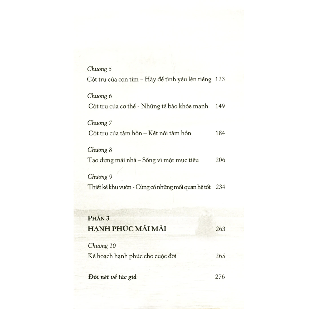 Những trải nghiệm có thật trong cuộc sống cũng như những nghiên cứu của tác giả đã ảnh hưởng đến suy nghĩ của tác giả về hạnh phúc. Theo đó, có bảy bước rất đơn giản giúp bạn trải nghiệm niềm hạnh phúc đích thực. Với hình ảnh Ngôi nhà ẩn dụ cho cuộc sống con người, tác giả đã mượn hình ảnh này làm biểu tượng cho ý tưởng của mình: bảy bước để xây dựng “ngôi nhà hạnh phúc”. Bảy bước này có liên quan đến bảy đối tượng mà bạn cần quan tâm trong cuộc sống của mình: sức mạnh bản thân, tinh thần, con tim, cơ thể, tâm hồn, mục tiêu và con người.