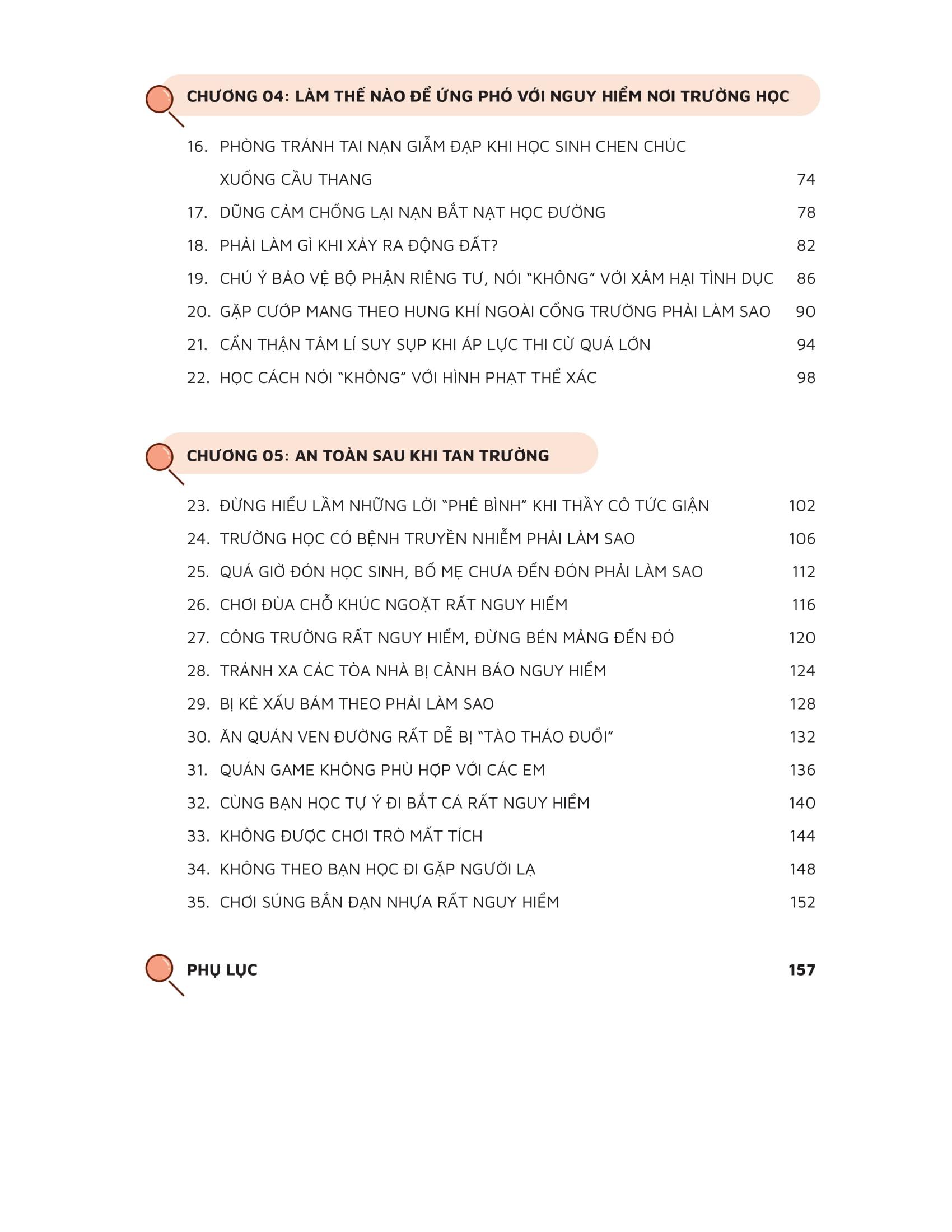 Cuốn sách gồm 5 chương với 35 bối cảnh, về cơ bản sẽ bao quát hết các khía cạnh đời sống học đường của trẻ. Cuốn sách này có thể coi như một bộ học liệu đào tạo có tính hệ thống để trẻ tự học về kiến thức an toàn khi đi học hoặc có thể coi như cẩm nang hướng dẫn giúp trẻ tìm ra câu trả lời cho các vấn đề an toàn tại trường học mà trẻ gặp phải.