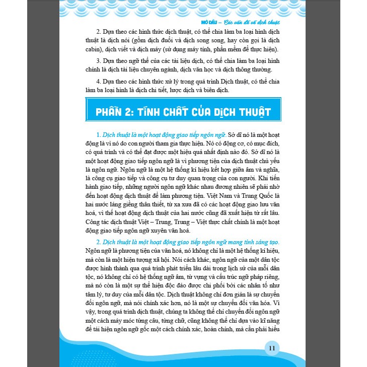 Giáo trình gồm cả hai kỹ năng biên dịch và phiên dịch. Các kỹ năng được phân bổ cân đối, đồng thời trang bị cho người học năng lực biên và phiên dịch. - Giáo trình dịch hai chiều Trung – Việt và Việt – Trung. Các nội dung lý thuyết và bài tập chú trọng cả 2 ngôn ngữ, qua đó giúp người học rèn luyện kỹ năng dịch Trung – Việt và Việt – Trung.