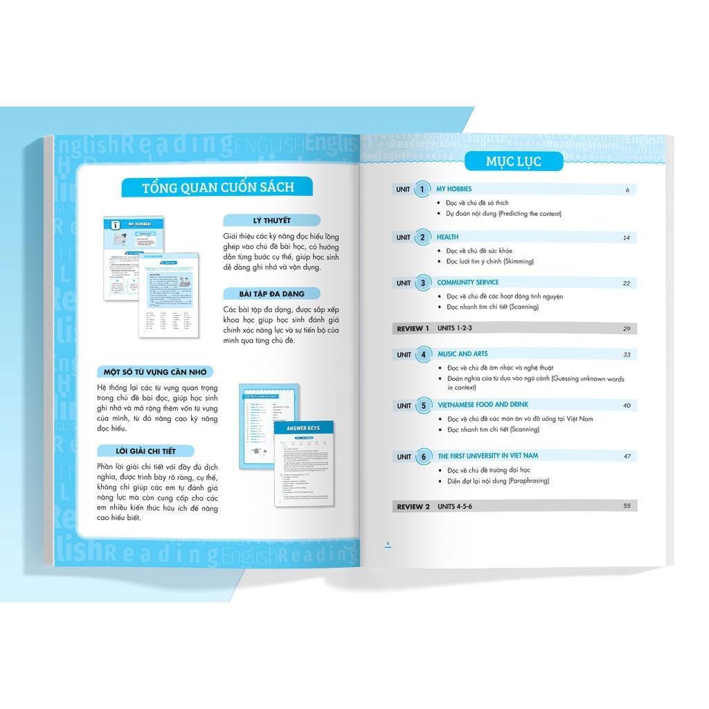 - Nội dung kiến thức bám sát khung chương trình của Bộ Giáo dục và Đào tạo Cuốn sách giúp các em nắm vững kiến thức đã học trên lớp cũng như ôn luyện thêm các bài tập nâng cao, hỗ trợ quá trình tự học tiếng Anh hiệu quả, giới thiệu các kỹ năng đọc hiểu với hướng dẫn từng bước cụ thể, giúp học sinh dễ dàng ghi nhớ và vận dụng. Giới thiệu các kỹ năng đọc hiểu lồng ghép vào chủ đề bài học, có hướng dẫn từng bước cụ thể, giúp học sinh dễ dàng ghi nhớ và vận dụng.