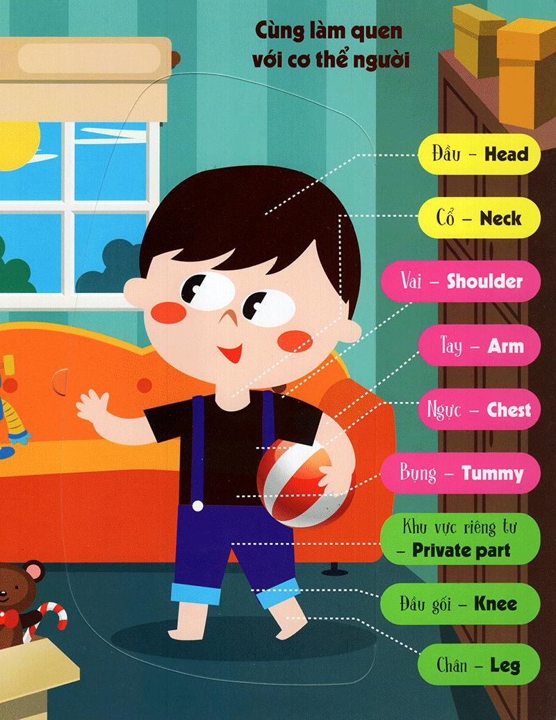 Bố mẹ và bé hãy mở cuốn sách này ra rồi lật những miếng ghép lên để cùng học rất nhiều từ song ngữ Việt – Anh về cơ thể người nhé!