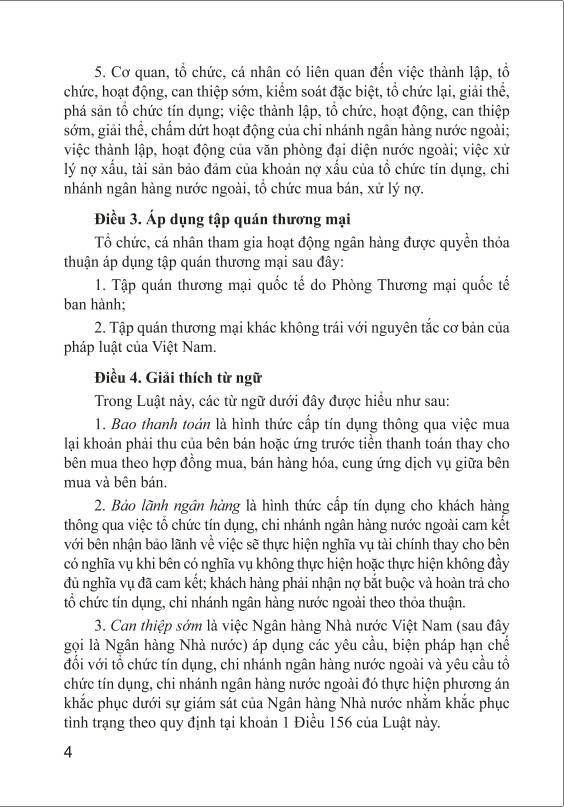 Luật này qui định về việc thành lập, tổ chức, hoạt động, can thiệp sớm, kiểm soát đặc biệt, tổ chức lại, giải thể, phá sản tổ chức tín dụng; việc thành lập, tổ chức, hoạt động, can thiệp sớm, giải thể, chấm dứt hoạt động của chi nhánh ngân hàng nước ngoài; việc thành lập, hoạt động của văn phòng đại diện tại Việt Nam của tổ chức tín dụng nước ngoài, tổ chức nước ngoài khác có hoạt động ngân hàng; việc xử lý nợ xấu, tài sản bảo đảm của khoản nợ xấu của tổ chức tín dụng, chi nhánh ngân hàng nước ngoài, tổ chức mà Nhà nước sở hữu 100% vốn điều lệ có chức năng mua, bán, xử lý nợ.