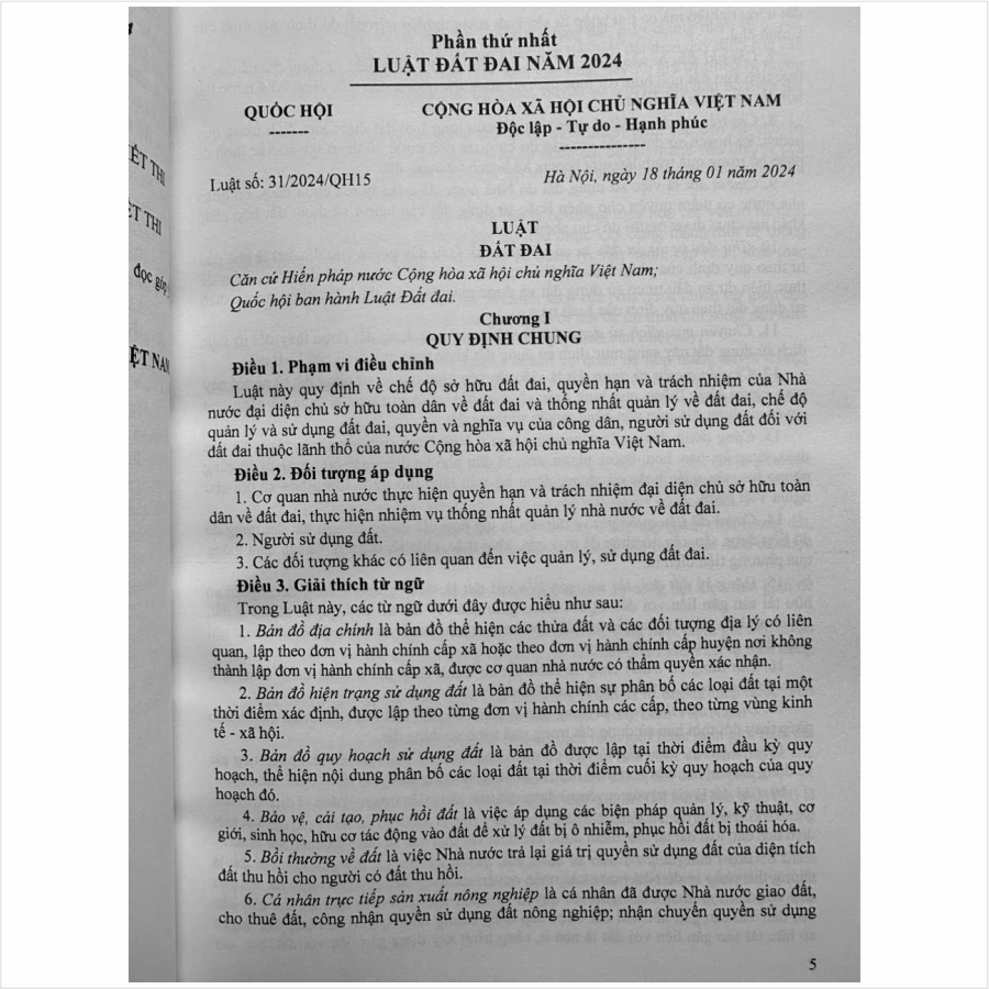 Luật Đất đai số 31/2024/QH15 được Quốc hội nước Cộng hòa xã hội chủ nghĩa Việt Nam khóa XV, kỳ họp bất thường lần thứ năm thông qua ngày 18 tháng 01 năm 2024,
