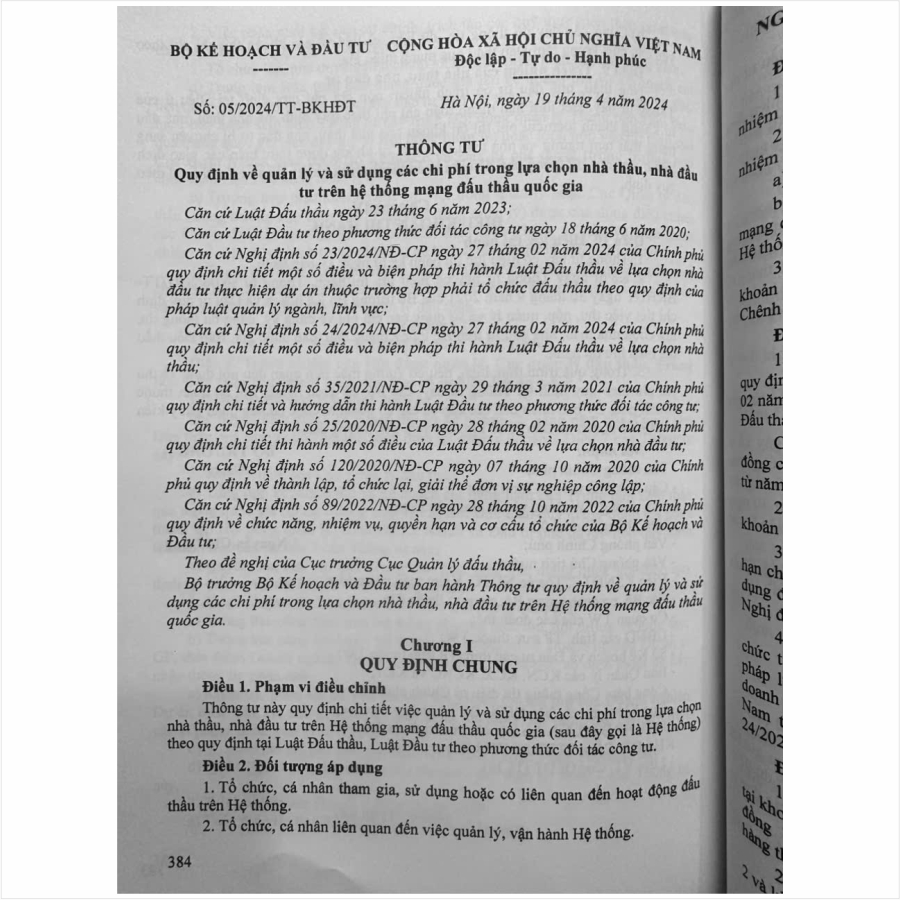 – Thông tư số 05/2024/TT-BKHĐT ngày 19 tháng 4 năm 2024 của Bộ Kế hoạch và Đầu tư quy định về quản lý và sử dụng các chi phí trong lựa chọn nhà thầu, nhà đầu tư trên Hệ thống mạng đấu thầu quốc gia;