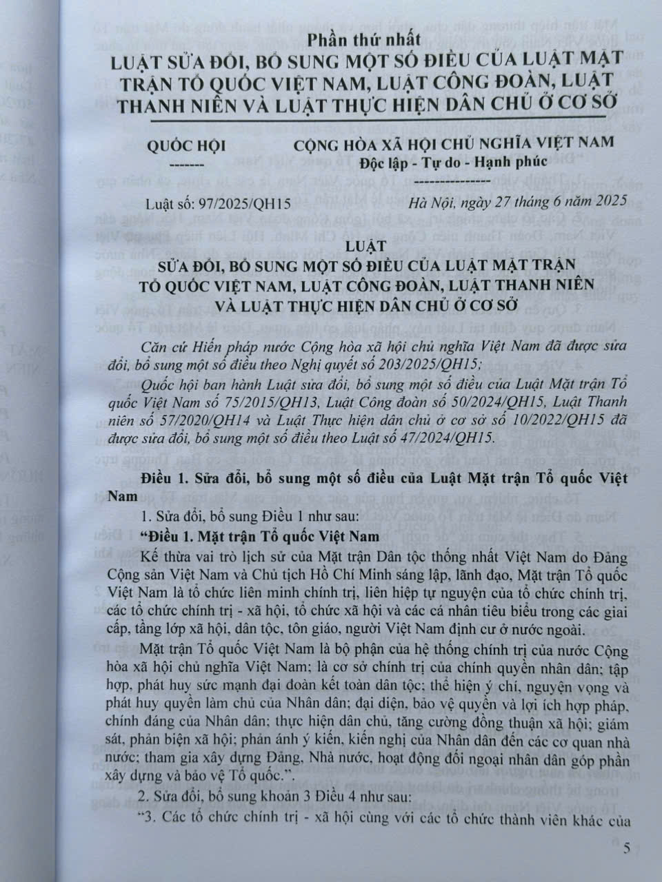 Phần thứ nhất. LUẬT SỬA ĐỔI, BỔ SUNG MỘT SỐ ĐIỀU CỦA LUẬT MTTQVN, LUẬT CÔNG ĐOÀN, LUẬT THANH NIÊN VÀ LUẬT THỰC HIỆN DÂN CHỦ Ở CƠ SỞ