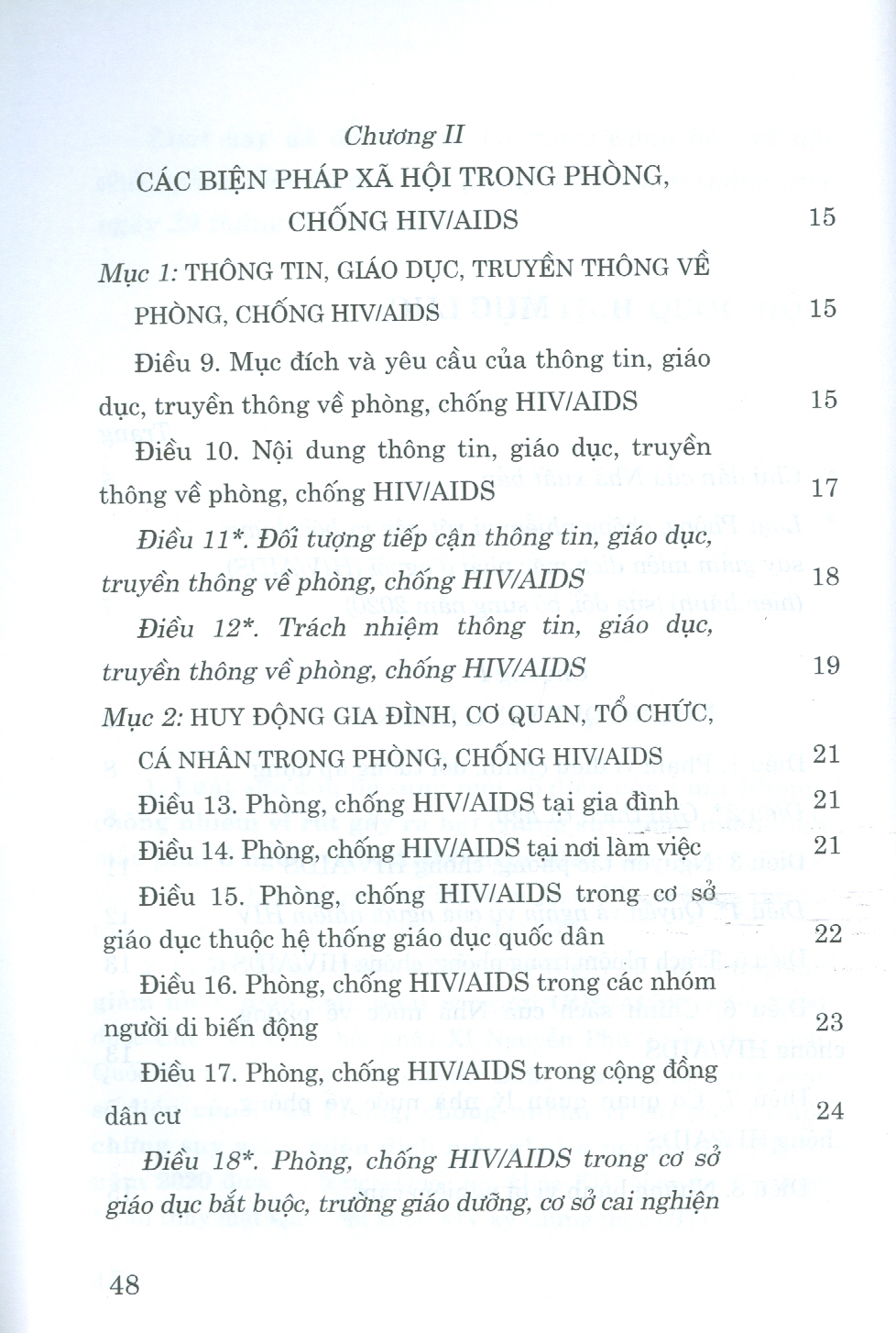 Cuốn sách gồm 6 chương, 50 điều quy định các biện pháp phòng, chống HIV/AIDS; việc chăm sóc, điều dưỡng, hỗ trợ người nhiễm HIV và các điều kiện bảo đảm thực hiện biện pháp phòng, chống HIV/AIDS. Nội dung cuốn sách được hợp nhất từ Luật Phòng, chống nhiễm vi rút gây ra hội chứng suy giảm miễn dịch mắc phải ở người (HIV/AIDS) năm 2006 và Luật sửa đổi, bổ sung một số điều của Luật Phòng, chống nhiễm vi rút gây ra hội chứng suy giảm miễn dịch mắc phải ở người (HIV/AIDS) năm 2020. Luật được Quốc hội nước Cộng hòa xã hội chủ nghĩa Việt Nam khóa XIV, kỳ họp thứ 10 thông qua ngày 16/11/2020, có hiệu lực thi hành từ ngày 01/7/2021.