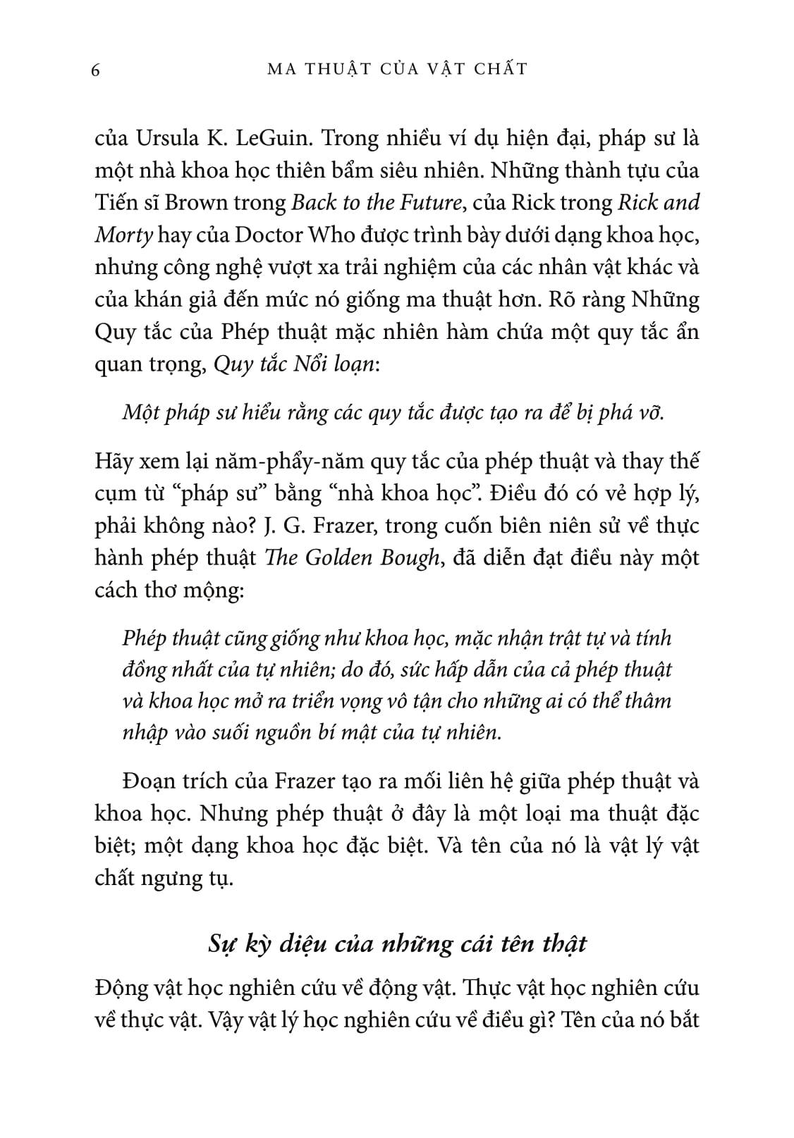 Vật lý vật chất ngưng tụ là những gì xảy ra khi các nguyên tử tụ lại với nhau để tạo ra thứ gì đó có kích thước mà chúng ta có thể hiểu được – như chiếc xe hơi, hay một thiên hà. Đó là thứ làm cho mọi vật lơ lửng trong không trung hoặc khiến các tinh thể phát sáng. Đó cũng là những gì mà chúng ta gọi là ma thuật. Với Ma thuật của vật chấtr, tác giả đưa bạn đọc vào một cuộc phiêu lưu thực nghiệm trong vật lý vật chất ngưng tụ, cơ chế khoa học đằng sau những bí ẩn của thuật giả kim, chuyển hóa và nhiều hơn thế nữa. Cuốn sách là bản hướng dẫn về cách khai thác các hoạt động bí ẩn của thế giới tự nhiên để trở thành một pháp sư thời hiện đại.