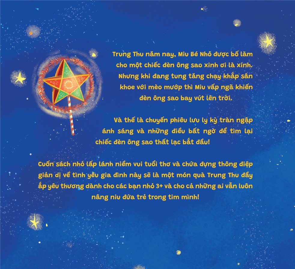 Mua tại TiktokNhà phát hành: Nhã Nam Nhà xuất bản: Hội Nhà Văn Viết lời: Kawa Minh họa: Mai Anh Đỗ Số trang: 36 Kích thước: 20.5 x 24 cm Trung Thu năm nay, Miu Bé Nhỏ được bố làm cho một chiếc đèn ông sao xinh ơi là xính. Nhưng khi đang tung tăng chạy khắp sân khoe với mèo mướp thì Miu vấp ngã khiến đèn ông sao bay vút lên trời. Và thế là chuyến phiêu lưu ly kỳ tràn ngập ánh sáng và những điều bất ngờ để tìm lại chiếc đèn ông sao thất lạc bắt đầu! Cuốn sách nhỏ lấp lánh niềm vui tuổi thơ và chứa đựng thông điệp giản dị về tình yều gia đình này sẽ là một món quà Trung Thu đầy ắp yêu thương dành cho các bạn nhỏ 3+ và cho cả những ai vẫn luôn nâng niu đứa trẻ trong tim mình!
