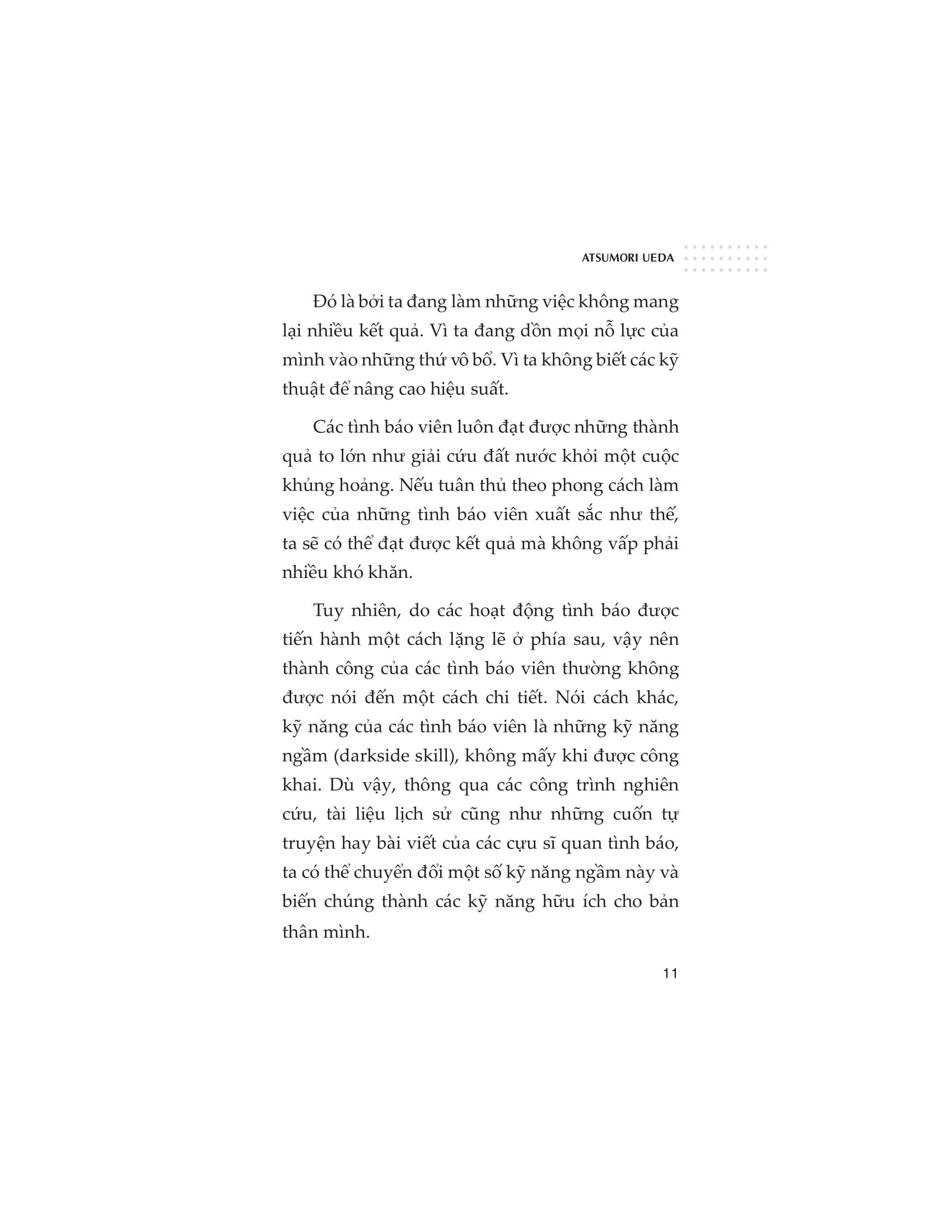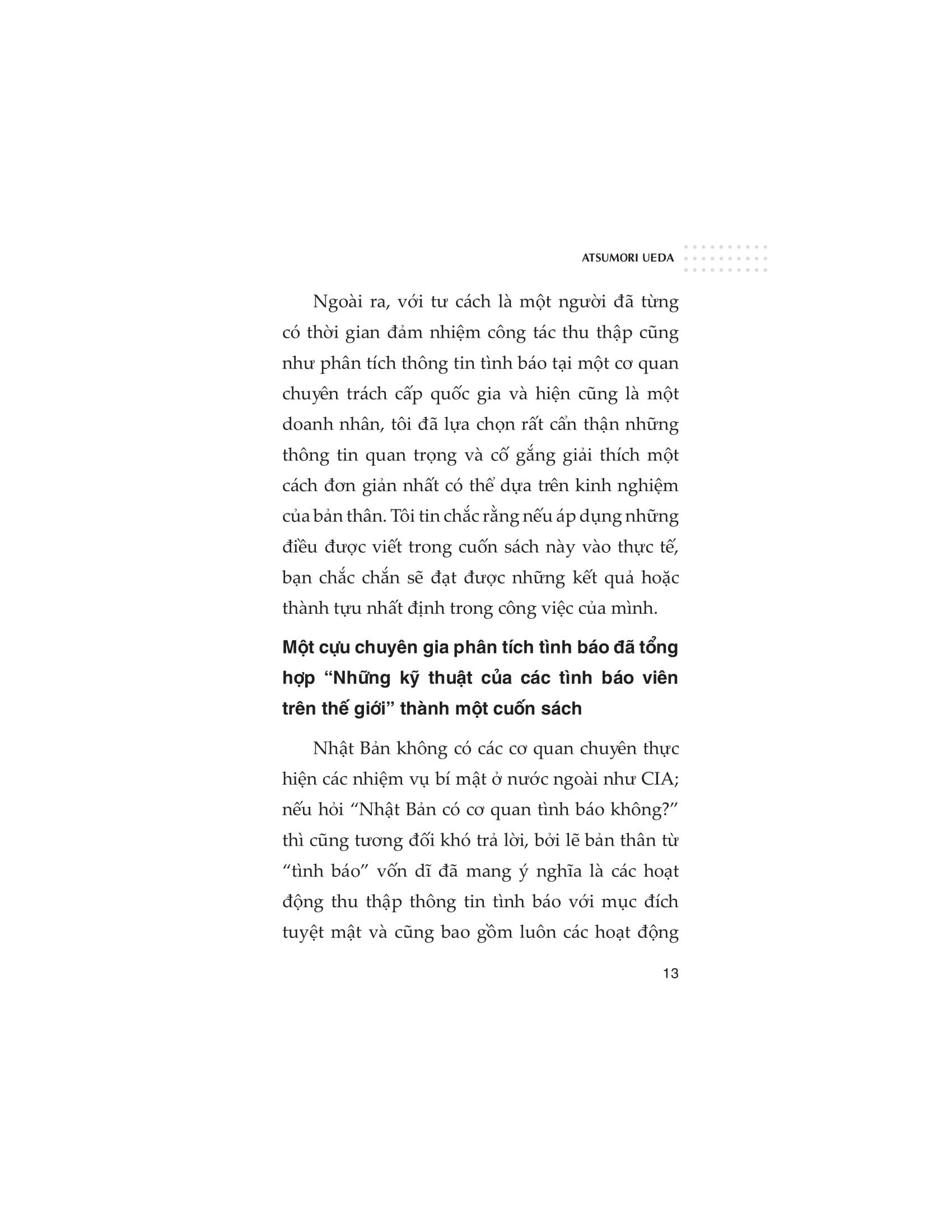 Thông qua việc tìm hiểu và tập hợp lại những kỹ năng ngầm của các tình báo viên từ trải nghiệm cá nhân và nhiều nguồn khác, tác giả Atsumori Ueda, cựu chuyên gia phân tích tình báo của Bộ Quốc phòng Nhật Bản, sẽ chia sẻ cho độc giả những hiểu biết sâu sắc về cách sử dụng trí óc và tư duy cùng bộ bí kíp vô cùng hữu ích.
