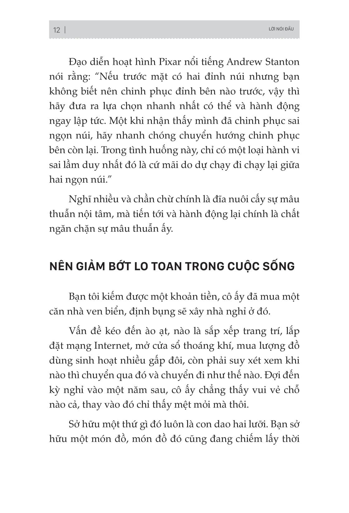 Nếu bạn không có đủ củi để nấu sôi một ấm nước đầy thì hãy bỏ bớt nước đi, đừng cố gắng chạy đi kiếm củi nữa. Nếu cuộc sống đôi khi quá mệt mỏi, không đủ nghị lực để tiếp tục, thì bớt lại sự tham cầu ước vọng sẽ thấy tâm m.ình nhẹ nhõm hơn. Đừng vội vã, hãy ăn ngon uống kỹ, tôn trọng niềm vui ban sơ của m.ình, nên chơi, nên vui, để cuộc sống được cân bằng giữa làm việc và nghỉ ngơi.