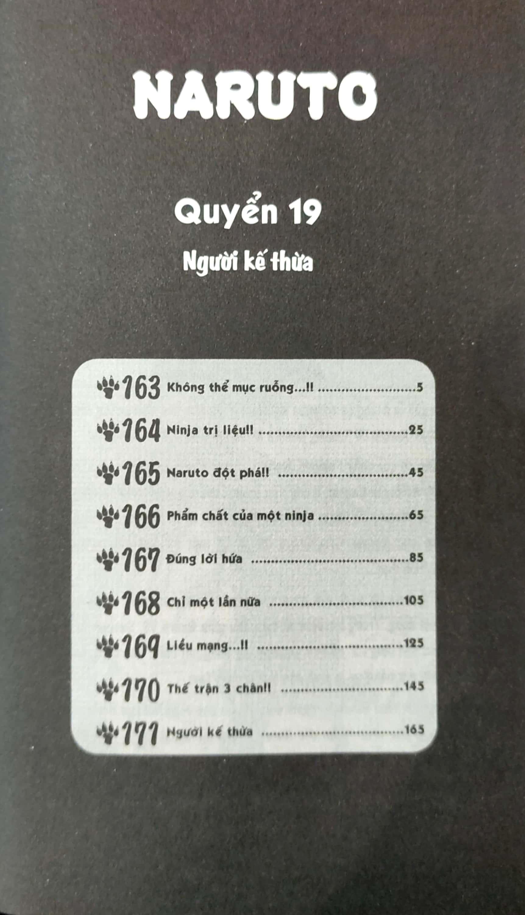 Mua tại TiktokNaruto - Tập 19 - Người Kế Thừa “Quả nhiên chỉ có hồi ức này là không thể mục rữa...”. Sự hiện diện của Naruto đã xóa bỏ hết những lầm lạc của Tsunade. Đòn tấn công giữa Tsunade, Orochimaru và Kabuto đã dẫn lối Jiraiya, Naruto và Shizune tìm đến, báo hiệu cho một trận đấu độc nhất vô nhị!! MASASHI KISHIMOTO “Nhoằng một cái tôi đã vẽ NARUTO được 4 năm. Tôi đã luôn nỗ lực cố gắng đến tận bây giờ... và cũng có chút chìm đắm trong thế giới này. Tôi cũng sẽ tiếp cố gắng cho năm thứ 5 sắp tới!”