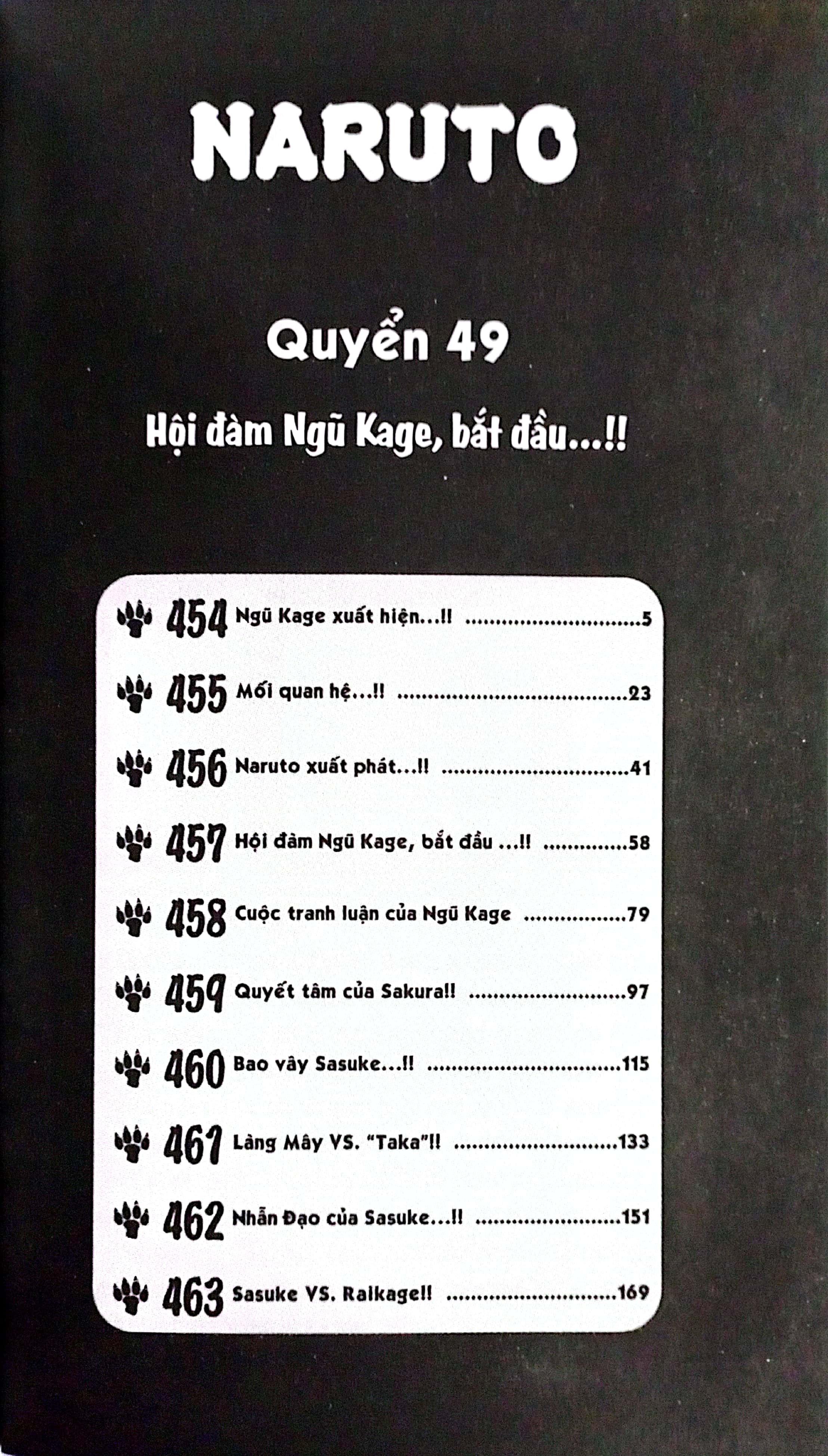 Mua tại TiktokNaruto - Tập 49 - Hội Đàm Ngũ Kage, Bắt Đầu…!! Nhằm triệt hạ Akatsuki cùng mưu đồ thống trị của chúng, Hội đàm Ngũ Kage đã được tổ chức theo lời kêu gọi của Raikage. Đại diện các làng lần lượt tập trung ở Thiết Quốc! Trong lúc đó, trước chủ trương triệt hạ Sasuke của làng Mây, để thù hận không kéo theo thù hận, Naruto quyết định trực tiếp đứng ra đàm phán với Raikage…!? MASASHI KISHIMOTO “Dạo này làm việc một m.ình buồn quá, nên tôi thường mở phim lên coi. Định bụng vừa tập trung làm việc vừa lướt phim, nhưng khi nhận ra, tôi lại đang tập trung xem phim và vẽ qua loa đại khái mới chết. Kiểu này tới lúc xem trúng bộ ba phim liên hoàn thì không biết thế nào đây…” (Toát mồ hôi)