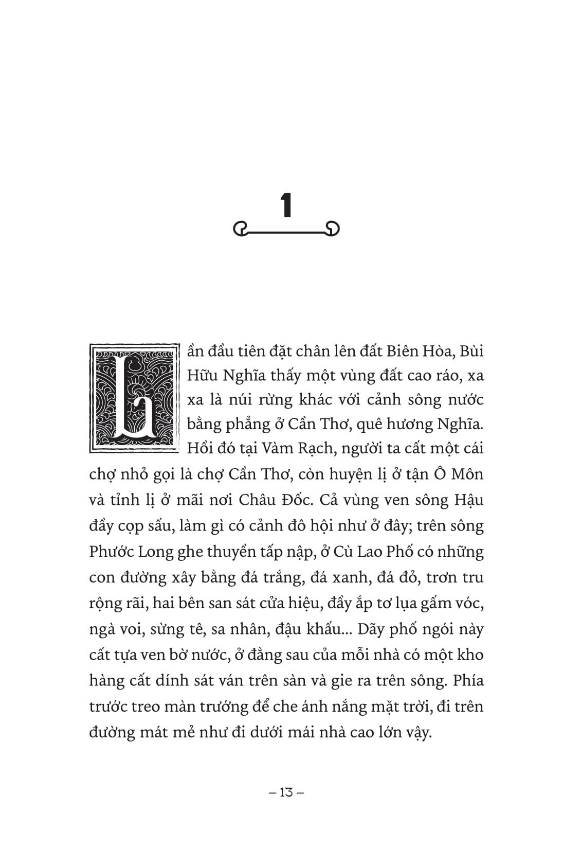 “Xế trưa, đám rước vừa vào tới ngõ. Tiếng p.háo nổ vang lừng, tiếng đàn, tiếng sáo của đoàn bát âm rộn ràng, vui vẻ. Đi đầu là lá cờ đuôi nheo rồi đến tấm biển “ân tứ vinh quy”, Bùi Hữu Nghĩa khăn nhiễu tam giang, áo gấm lam, quần trắng, đi vân hài, ngồi trên võng điều mui trần có hai người khiêng, trên đầu che lọng xanh. Đến cổng, Nghĩa bước xuống võng vào nhà, chào hỏi mọi người. Ai nấy đều vui vẻ chào mừng ông Thủ khoa vừa thi đỗ.”