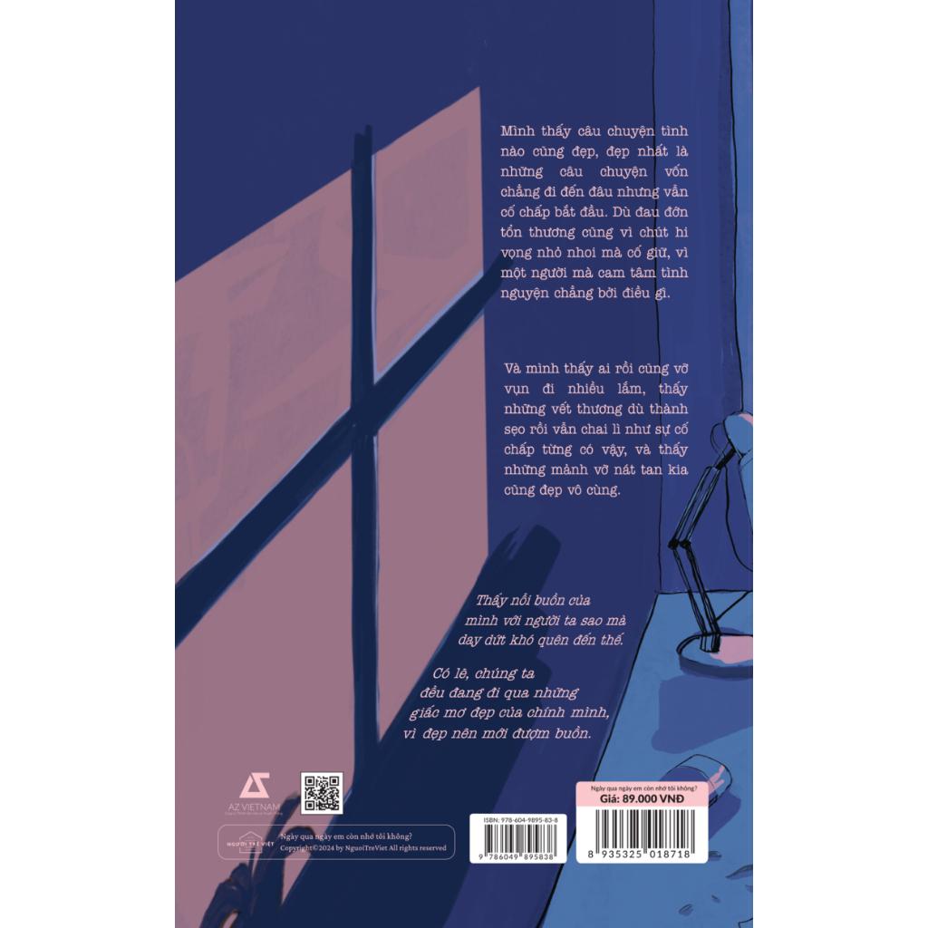 Ai trong chúng ta rồi cũng sẽ yêu và trở thành mảnh ghép trong cuộc đời của một ai đó, có khi vừa vặn, có lúc chông chênh. Thời gian có thể ngắn có thể dài, may mắn thì đồng hành cùng nhau tới cuối con đường, còn không duyên phận thì đành bỏ lỡ và đánh mất nhau giữa đoạn hành trình. Ai rồi cũng sẽ lại yêu, cũng sẽ thương một người hết lòng. Dù có thể bước cùng nhau đến cuối con đường hay là rời xa mãi mãi, thì bản thân cũng nên mỉm cười, chẳng có ai là hoàn hảo và cũng chẳng chuyện tình nào là trọn vẹn, vì suy cho cùng những khái niệm mơ hồ đó còn tùy thuộc vào cảm nhận của bản thân mỗi người đã trải qua những tình yêu, cảm xúc và nỗi đau khác nhau. Ai trong chúng ta cũng đã ít nhất một lần nếm thử cảm giác chờ đợi. Chờ những điều mà chính bản thân họ cũng không biết liệu nó có đến hay không. Mà có khi chính bạn cũng đang nằm trong số đó, phải không? Có một sự mơ hồ mà bạn không cách nào lý giải. Thế nhưng bạn vẫn cam tâm tình nguyện chờ đợi. “Ngày qua ngày, em còn nhớ tôi không?” cũng đong đầy những cảm xúc như thế. Tựa pháo hoa rực rỡ trong màn đêm rồi chợt vụt tắt, những mối tình cứ ngỡ là định mệnh mà cả đời này bạn tìm kiếm, thế nhưng ở đó chỉ có chằng chịt vết xước, tổn thương đến mãi sau này. Từng trang sách chứa những lời tâm sự, trải lòng đầy sự nuối tiếc nhưng cũng không kém phần nhẹ nhõm, để bạn nhận ra rằng: “Đừng nghĩ rằng mình không xứng đáng, không giữ nổi yêu thương, rồi sẽ có người kiên nhẫn ở bên, đi cùng bạn đến cuối con đường. Chúng ta xứng đáng có được hạnh phúc!” Đừng lo lắng nếu bạn đang cảm thấy cô đơn hay chỉ có một mình, đoạn kết tốt đẹp luôn ở những chương cuối cùng. Mong bạn luôn là chính mình, là bạn tốt hơn mỗi ngày ở hiện tại. Cuộc sống nhất định sẽ mang đến cho bạn những điều bất ngờ thú vị, và ở đâu đó trong đời, có một người vẫn đang cố gắng mỗi ngày và tiến về phía bạn gần hơn. Hãy khép lại những tổn thương ở đây để cùng bước sang một chương mới đầy yêu thương và hạnh phúc!