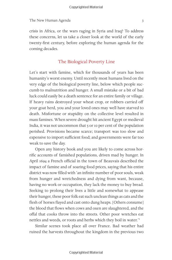 Over the past century humankind has managed to do the impossible and rein in famine, plague, and war. This may seem hard to accept, but, as Harari explains in his trademark style—thorough, yet riveting—famine, plague and war have been transformed from incomprehensible and uncontrollable forces of nature into manageable challenges. For the first time ever, more people die from eating too much than from eating too little; more people die from old age than from infectious diseases; and more people commit suicide than are killed by soldiers, terrorists and criminals put together. The average American is a thousand times more likely to die from binging at McDonalds than from being blown up by Al Qaeda.