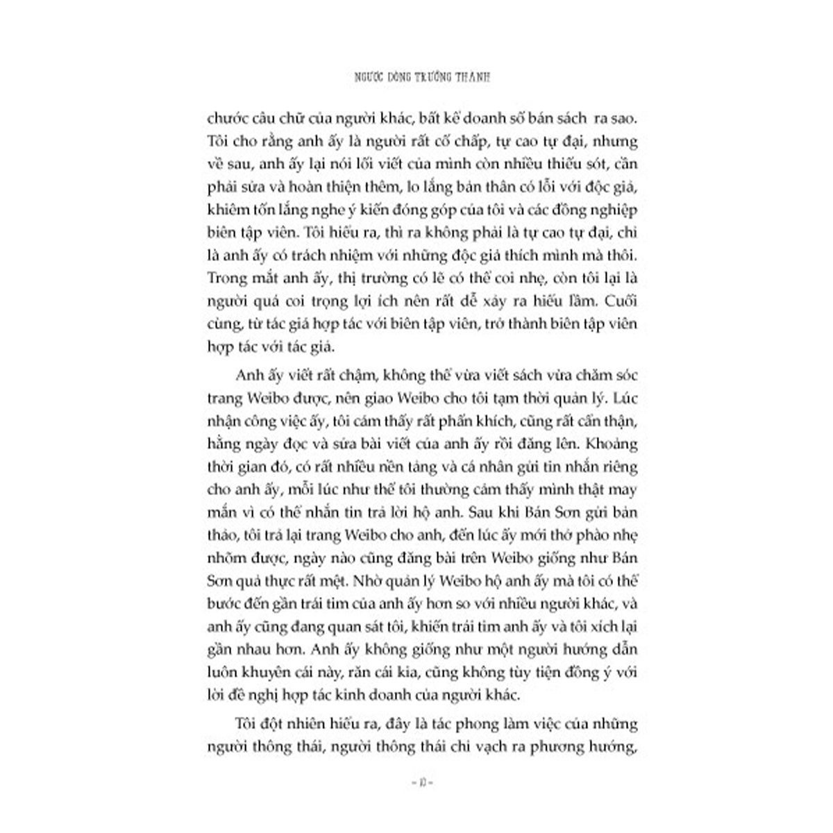 THÔNG TIN TÁC PHẨM Tác giả: Bán Sơn Dịch giả: Tiểu Triệu (Triệu Cẩm Tú) Khổ: 14,5x20,5 cm Độ dày: 1 cm Khối lượng: 400 g Số trang: 324 trang Nhà xuất bản Dân Trí ISBN: 978-604-40-3358-7 Code: 8 936056 792892 Giá bìa: 139.000 VNĐ Thời gian phát hành: tháng 7/2024   GIỚI THIỆU NỘI DUNG   Tác giả Bán Sơn ghi lại những trải nghiệm cuộc sống từ đô thị náo nhiệt đến núi Nga Mi yên tĩnh, từ bối rối và cô đơn đến tiêu hóa nỗi cô đơn, đạt được sự bình tĩnh, tìm được mục đích ban đầu và đạt được trí tuệ. Cuốn sách chứa đựng sự khích lệ những người trẻ khám phá, tìm hiểu và tận hưởng cuộc sống, đồng thời nhắc nhở những người trung niên hãy kiên trì với những khát vọng ban đầu và theo đuổi những suy nghĩ hồn nhiên. “Ngược dòng trưởng thành, mới có thể ngược gió bay cao” thuộc Bán Sơn văn tập do Quảng Văn sở hữu bản quyền và phát hành. “Ngược dòng trưởng thành” chính là gắng hết sức đương đầu với cuộc sống bão dông ngoài kia, bất chấp khó khăn mà vươn tới mục tiêu. “Mới có thể ngược gió bay cao” là khi con người ta đã có đủ bản lĩnh để cất cánh thì thử thách ngoài kia không thể cản được đường tiến bước. Với Bán Sơn thì cuộc sống hạnh phúc nhất, thư thái nhất, con người nhất mà ông muốn nói đến trong sách là cuộc sống nơi con người và thiên nhiên giao hòa, giao cảm, không xô bồ, ồn ã, vô lo vô nghĩ, đắm mình vào cảm xúc nhân gian, yêu ghét mừng giận, hỉ nộ ái ố. Và trên hết, chỉ có tình yêu mới cứu rỗi được tâm hồn của chúng ta, giúp ta thăng hoa, giúp ta vươn cao. TRÍCH DẪN TRONG SÁCH “NGƯỢC DÒNG TRƯỞNG THÀNH MỚI CÓ THỂ NGƯỢC GIÓ BAY CAO”: “Ngày nào cũng đều là một ngày mới” là tìm kiếm chân lý phát triển của sự vật thấu đáo nhất, sự tươi mới sẽ không lừa dối con người; cảm giác yêu thích sẽ không lừa dối con người; tâm trạng tuyệt vời sẽ không lừa dối con người; nỗi niềm cảm động rưng rưng nước mắt sẽ không lừa dối con người, có là sẽ có, không có sẽ là không có. “Ngày nào cũng đều là một ngày mới” mới là bản chất của sự sống, là tự do lớn nhất của sinh mệnh, đời sống tinh thần tuy rằng vô hình, nhưng lại tồn tại ở khắp mọi nơi, thứ tuần hoàn vẫn cứ là quy luật của tự nhiên. Ngộ ra được điều này, thì sẽ ngộ ra được tất cả. “Ngày nào cũng đều là một ngày mới” chính là nhận ra cảm giác vô hạn bên trong cuộc đời có hạn, tìm được cảm giác tương tự như chốn về. GIỚI THIỆU TÁC GIẢ Bán Sơn từng giữ chức vụ điều hành cấp cao của nhiều công ty và cũng từng nhiều lần khởi nghiệp để kinh doanh riêng. Khi đã cảm thấy mệt mỏi với cuộc sống thành thị, Bán Sơn lên núi Nga Mi đọc sách, viết lách trong suốt 6 năm. Ông sống nơi núi sông nhưng không xem mình như ẩn sĩ, đi lại nhiều nơi nhưng rất ngại nhận quảng cáo thương mại. Do đó, ông được bạn bè và người hâm mộ coi như con người hiếm hoi giữ bản thân trong sạch trên Internet. Bài viết đầu tiên đăng tải trên tài khoản “Bán Sơn văn tập” cùng những trích dẫn trong đó đã được người trẻ truyền nhau chia sẻ rộng rãi.
