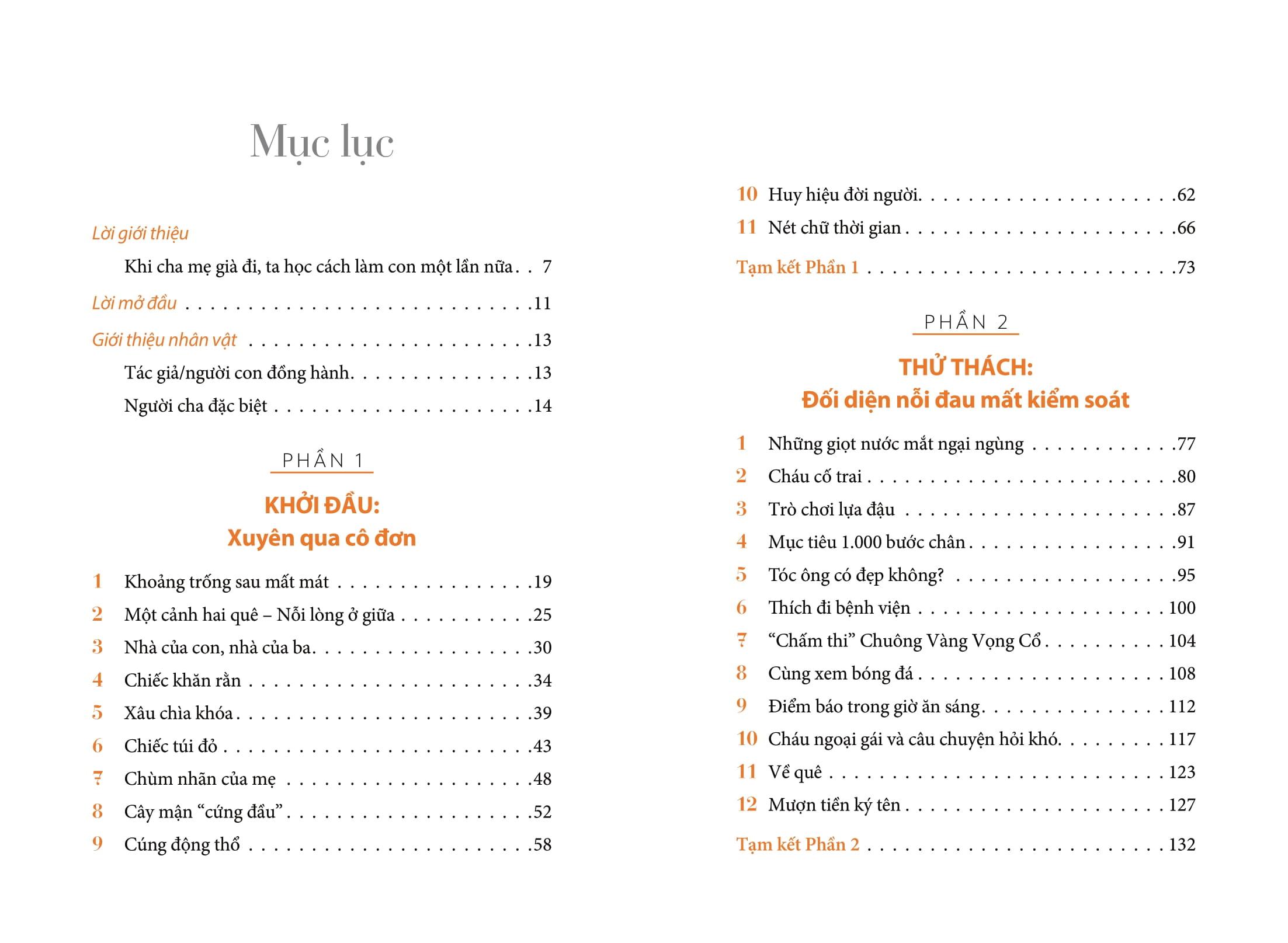 Đến một thời điểm, mọi nỗ lực níu giữ cần được thay thế bằng sự chấp nhận. Không phải buông xuôi, mà là bình thản đồng hành cùng cha mẹ qua đoạn cuối hành trình với tình yêu thương. Những câu chuyện ở phần này phản ánh giai đoạn sâu lắng, khi cả tác giả và cha học cách chấp nhận sự bào mòn của trí nhớ và hình ảnh người cha từng mạnh mẽ giờ đây trở nên mong manh.