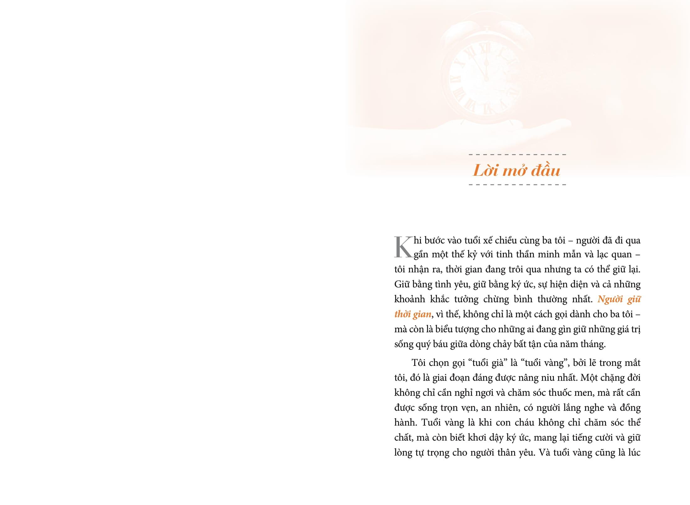 “Người giữ thời gian là cuốn sách của tình yêu thương và lòng hiếu kính. Tôi tin rằng qua từng trang viết chân thật và xúc động này, bạn – người đang miệt mài chăm sóc cha mẹ – sẽ tìm thấy sự đồng cảm sâu sắc, những lời khuyên hữu ích và cả nguồn động viên tinh thần quý giá. Với tất cả tấm lòng của một người con và một chuyên gia tâm lý đã đồng hành cùng nhiều gia đình, tôi trân trọng giới thiệu cuốn sách đến bạn. Hy vọng rằng Người giữ thời gian sẽ truyền cảm hứng để bạn giữ lấy thời gian, giữ lấy người thân yêu và giữ lấy tình yêu trong gia đình m.ình – hôm nay và mãi mãi.”