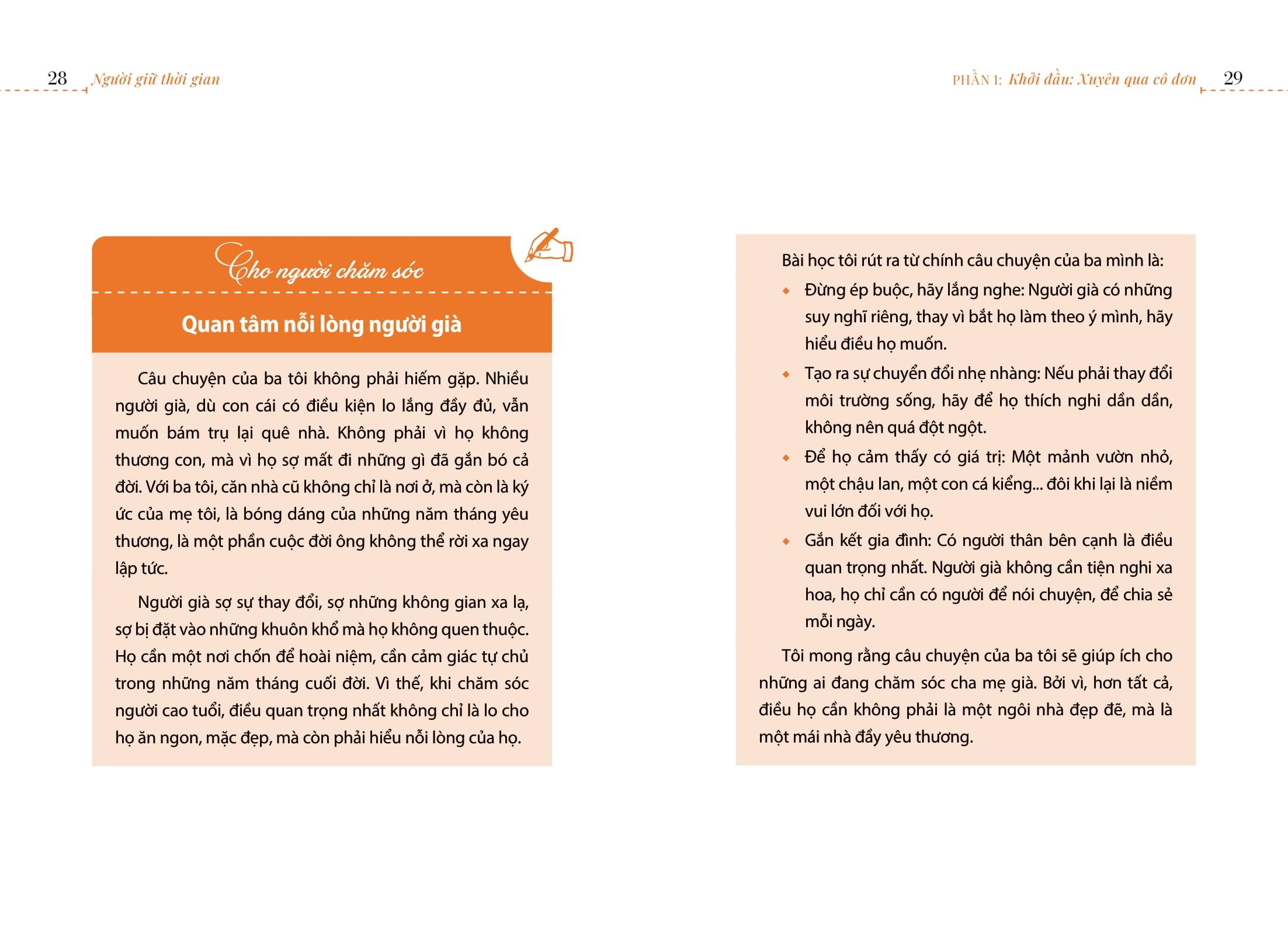 Sau sự ra đi của người mẹ, người cha bước vào hành trình sống một m.ình và ông bắt đầu đối diện với nhiều biến động cả về thể chất lẫn tinh thần. Ẩn sau những đồ vật quen thuộc và thói quen tưởng chừng nhỏ nhặt là những dấu hiệu ngày càng rõ rệt của sự cô đơn, buồn bã và sự mất hứng thú với cuộc sống. Những câu chuyện trong phần này khắc họa hành trình đầu tiên của tác giả cùng gia đình trong nỗ lực thuyết phục cha thay đổi môi trường sống, giúp ông thích nghi với hoàn cảnh mới. Qua những trang viết, tác giả tinh tế dẫn dắt người đọc khám phá các khía cạnh sâu sắc của mối quan hệ cha con, nơi không chỉ hiện diện nỗi đau mà còn là niềm vui, tiếng cười và những ký ức đẹp. Qua đó cho thấy việc chăm sóc người cao tuổi không chỉ đơn thuần là một nghĩa vụ, mà còn là một hành trình tràn đầy ý nghĩa và tình yêu thương. Sự hiện diện và lắng nghe được tác giả nhấn mạnh như những liều thuốc quý giá cho tâm hồn người cao tuổi.