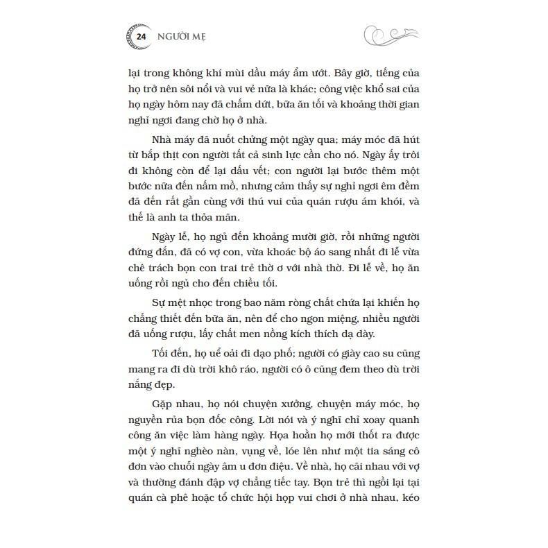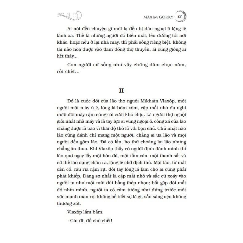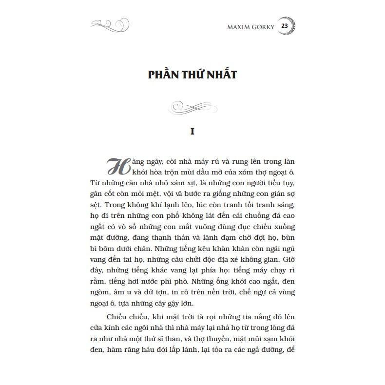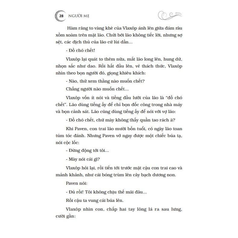 Mua tại TiktokMaxim Gorky (1868 - 1936), là “người đại biểu vĩ đại nhất của nền văn nghệ vô sản”. Trong số những tác phẩm của Maxim Gorky xứng đáng được xếp vào kho tàng văn học của nhân loại, trước hết phải kể đến hai cuốn tiểu thuyết: “Người mẹ” (19-19) và “Cuộc đời Klim Samgin” (1927-1936). Ngoài tiểu thuyết ông còn sáng tác kịch, truyện ngắn và truyện dài với các tác phẩm tiêu biểu như vở kịch “Dưới đáy” (1902), cùng bộ tác phẩm truyện dài nổi tiếng khác như: “Thời thơ ấu” (1913-1914); “Kiếm sống” (1916); “Các trường đại học của tôi” (1913-1923). "Người mẹ" là tác phẩm điển hình chiếm một vị trí đặc biệt không những trong sáng tác của nhà văn mà trong cả nền văn học thế giới thế kỷ XX. Tác phẩm có giá trị như một công trình nghiên cứu xuất sắc về phong trào công nhân dưới sự lãnh đạo của Đảng, về đời sống công nhân ở nhà máy lớn, về cuộc đấu tranh chống chủ nghĩa tư sản. Trong đó Paven là nhân vật tiêu biểu cho người chiến sĩ cách mạng vô sản, bà mẹ là hiện thân của quá trình giác ngộ cách mạng trong nhân dân. Ngay từ những năm 1930-1940, cuốn tiểu thuyết nổi tiếng "Người mẹ" đã là cuốn sách gối đầu giường của biết bao thanh niên Việt Nam thuộc thế hệ cách mạng kháng chiến chống Pháp. Cuốn sách mang sức sống đấu tranh này đã trang bị một vũ khí tư tưởng vô địch cho giai cấp công nhân và nhân dân lao động tấn công vào thành trì của bọn bóc lột.
