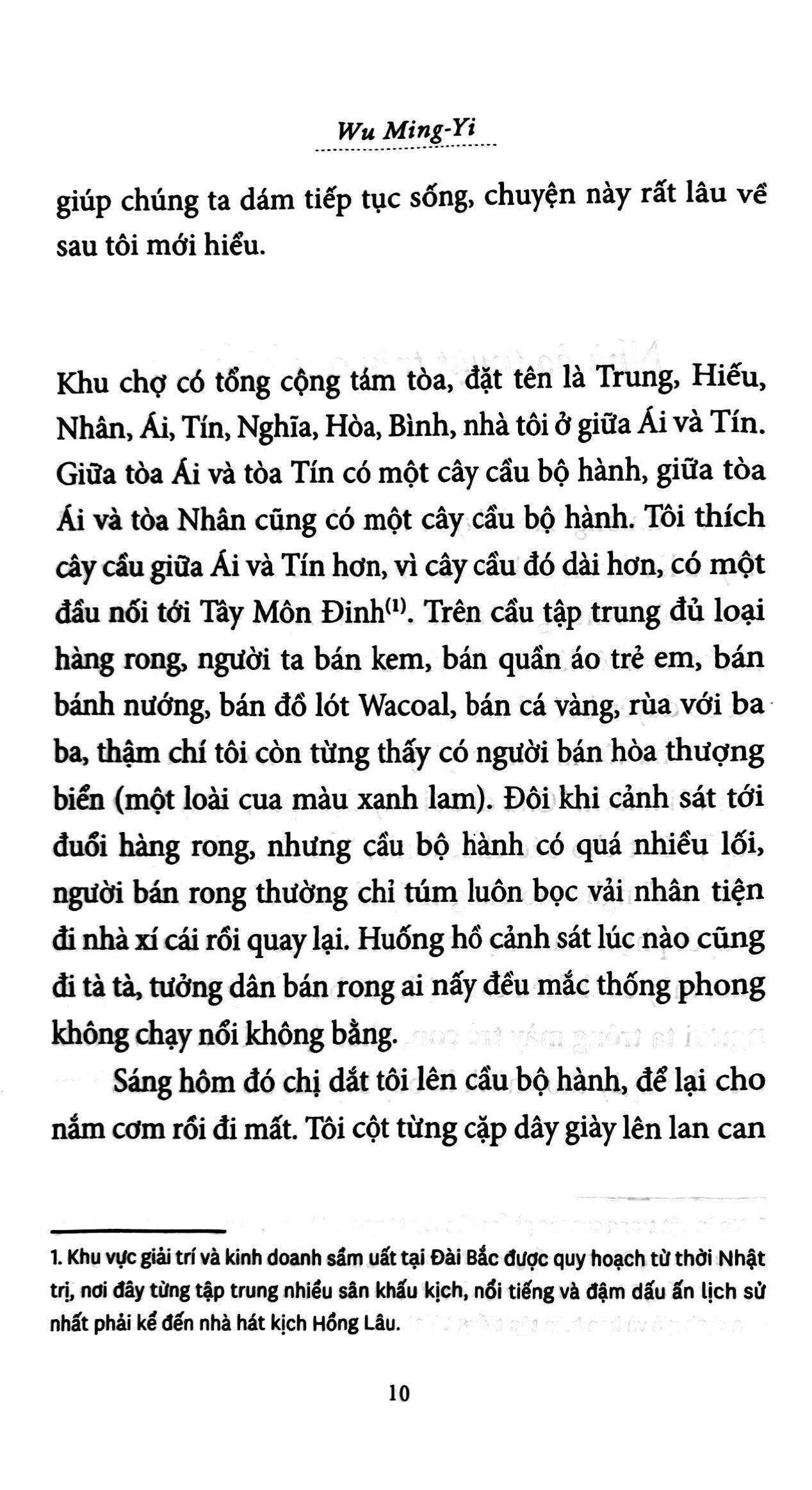 Tuyển tập gồm 10 truyện ngắn này có bối cảnh là khu chợ Trung Hoa ở Đài Bắc vào những năm 1970, với đề tài là câu chuyện trưởng thành của đám trẻ khu chợ, còn “nhà ảo thuật trên cây cầu bộ hành” đóng vai trò xuyên suốt, kết nối những câu chuyện ấy.