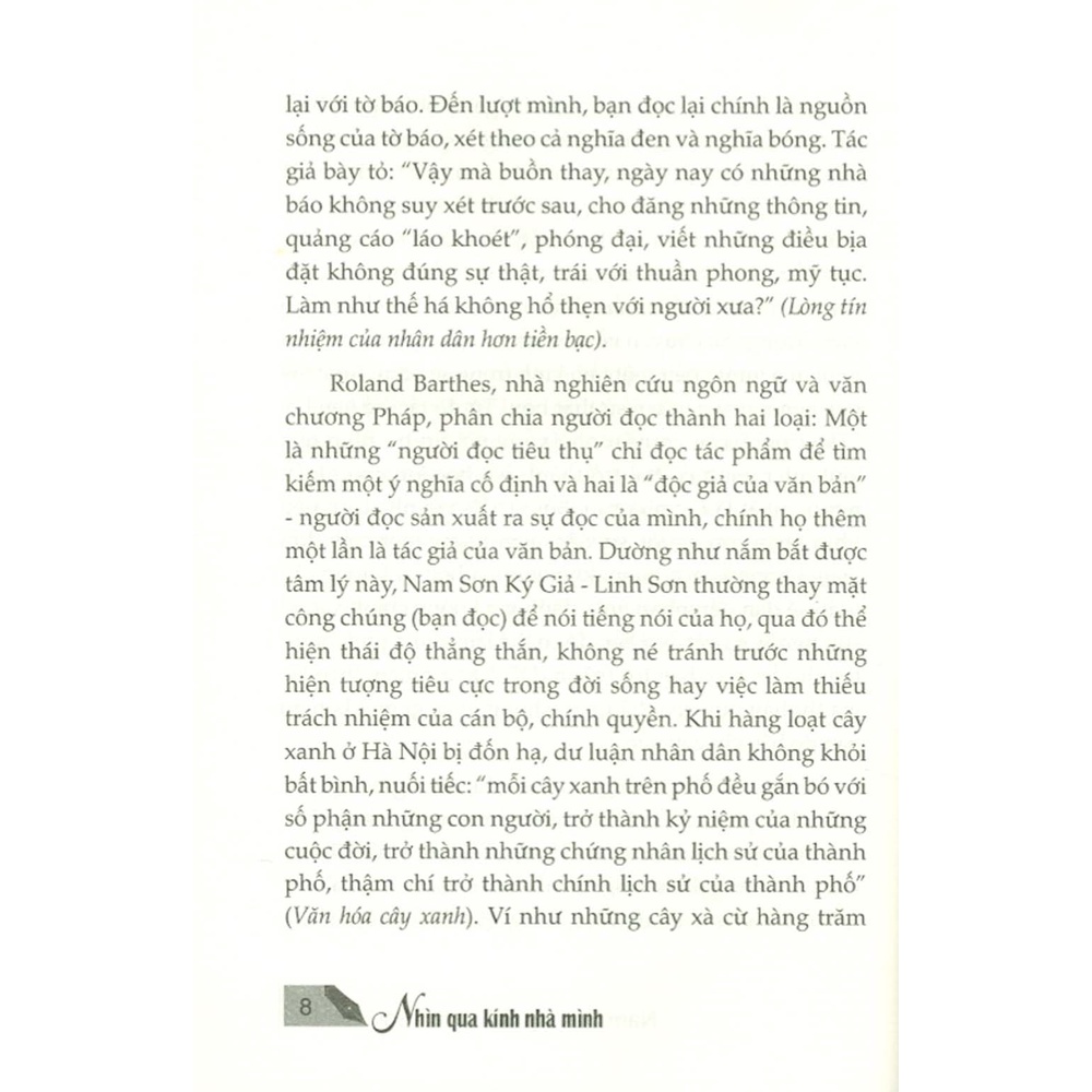 Sách - Nhìn Qua Kính Nhà Mình (Tập Tiểu Phẩm) Tác giả Nam Sơn Ký giả - Linh Sơn Nhà xuất bản NXB Thông Tin Và Truyền Thông Đơn vị phát hành NXB Thông Tin Và Truyền Thông Ngày xuất bản 05-2021 Số trang 346 Kích thước 14.5 x 20.5 cm Loại bìa Bìa mềm Nội dung "Tập sách này lựa chọn, giới thiệu với bạn đọc 113 tiểu phẩm của Nam Sơn Ký Giả - Linh Sơn viết cho các tạp chí Lý luận chính trị và Truyền thông, Người làm báo từ năm 2013 đến năm 2020 về các chủ đề Thời sự chính trị - xã hội (58 tác phẩm); Báo chí, truyền thông (28 tác phẩm); Nội dung quốc tế (27 tác phẩm). Trong phần lớn các tác phẩm của mình, Nam Sơn Ký Giả - Linh Sơn đều vận dụng kinh nghiệm cộng đồng, dựa trên những tiêu chuẩn phổ biến trong cộng đồng để nêu lên mong muốn về việc hoàn thiện nhân cách, đạo đức, văn hóa của con người, của xã hội, trong đó, có những người làm báo hoặc thông qua đó thể hiện rõ quan điểm, thái độ của mình trong cuộc đấu tranh tư tưởng vốn rất phức tạp. Đó là những bài viết về đạo đức, lương tâm nghề nghiệp báo chí: Báo hại; Câu khách; Ngáng chân; Vô duyên, vô cảm; Nước mắm bốc mùi; ""Nạn báo chí""; Phản cảm; Đó là những bài viết thể hiện tinh thần đấu tranh bảo vệ đất nước, đấu tranh tư tưởng: Vừa ăn cướp, vừa la làng; Từ xưa đến nay; Luật rừng; Nói dối hay cùng; Xấu chơi; Phẩm giá kẻ cắp; Là những bài viết về văn hóa đạo đức con người trong xã hội: Một chiếc giầy của Mahatma Gandhi; Bó tay; Lễ chùa; Hơn cả lách luật; Cuội; Con số và ngoài con số; Căn bệnh thật;"