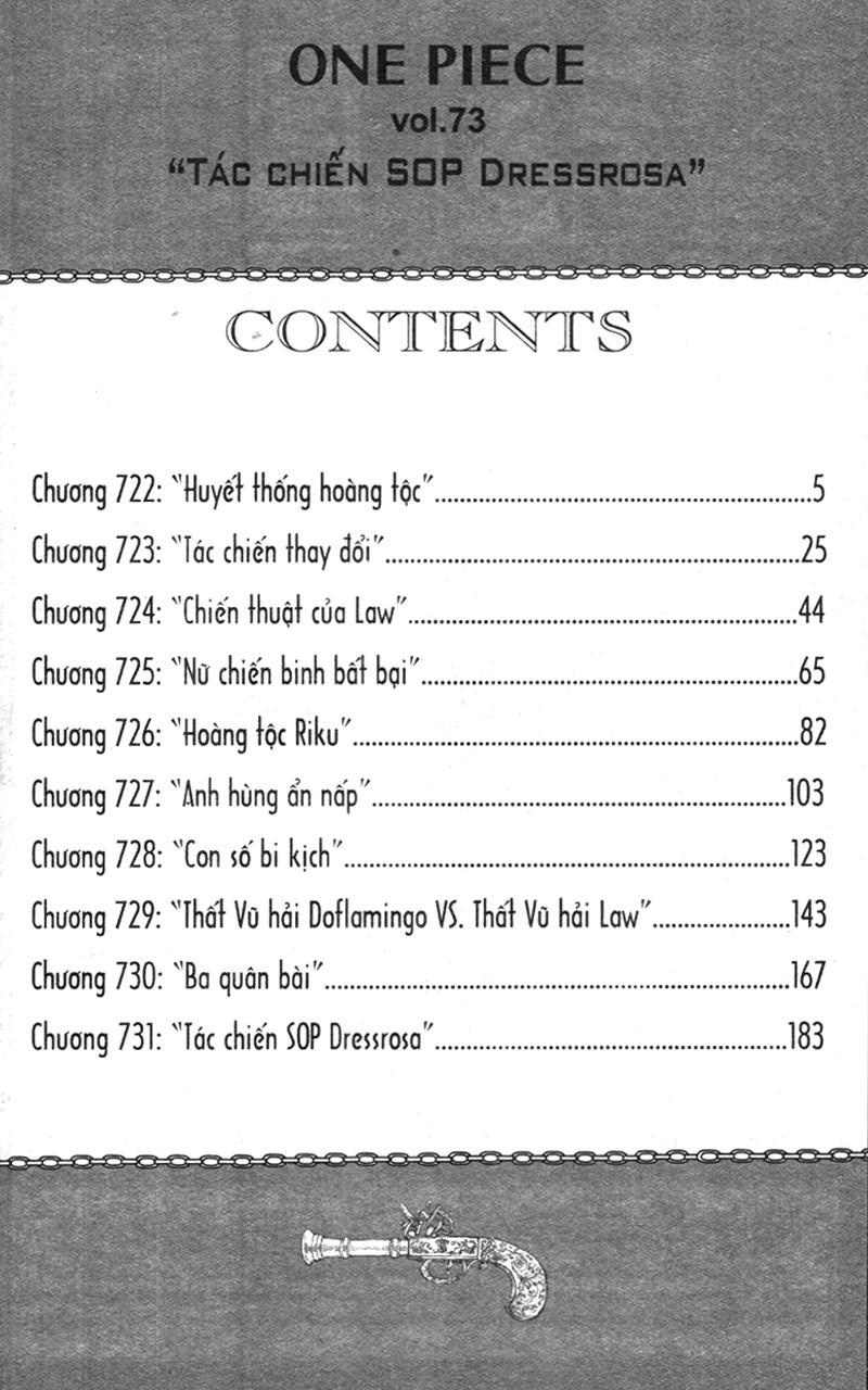 One Piece - Tập 73 - Tác Chiến SOP Dressrosa Trái với dự tính của Law, sự tình dần phát sinh theo hướng không tưởng. Thông qua đó, tấn bi kịch ở Dressrosa cũng dần hé lộ. Từng mặt trận nhỏ có nguy cờ dẫn tới một cuộc chiến toàn diện, báo hiệu thời khắc quyết đấu đang tới gần... Những chuyến phiêu lưu trên đại dương xoay quanh "One Piece" lại bắt đầu!!