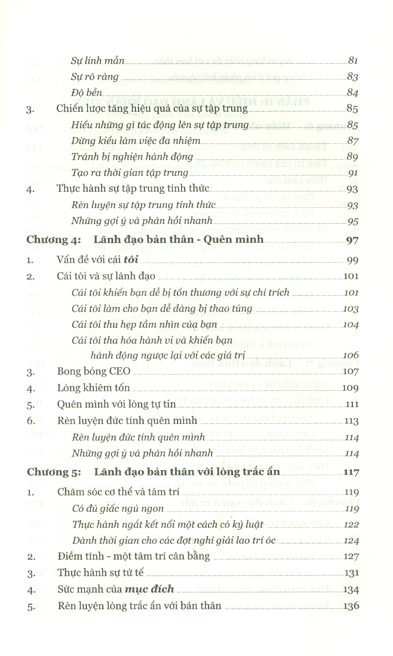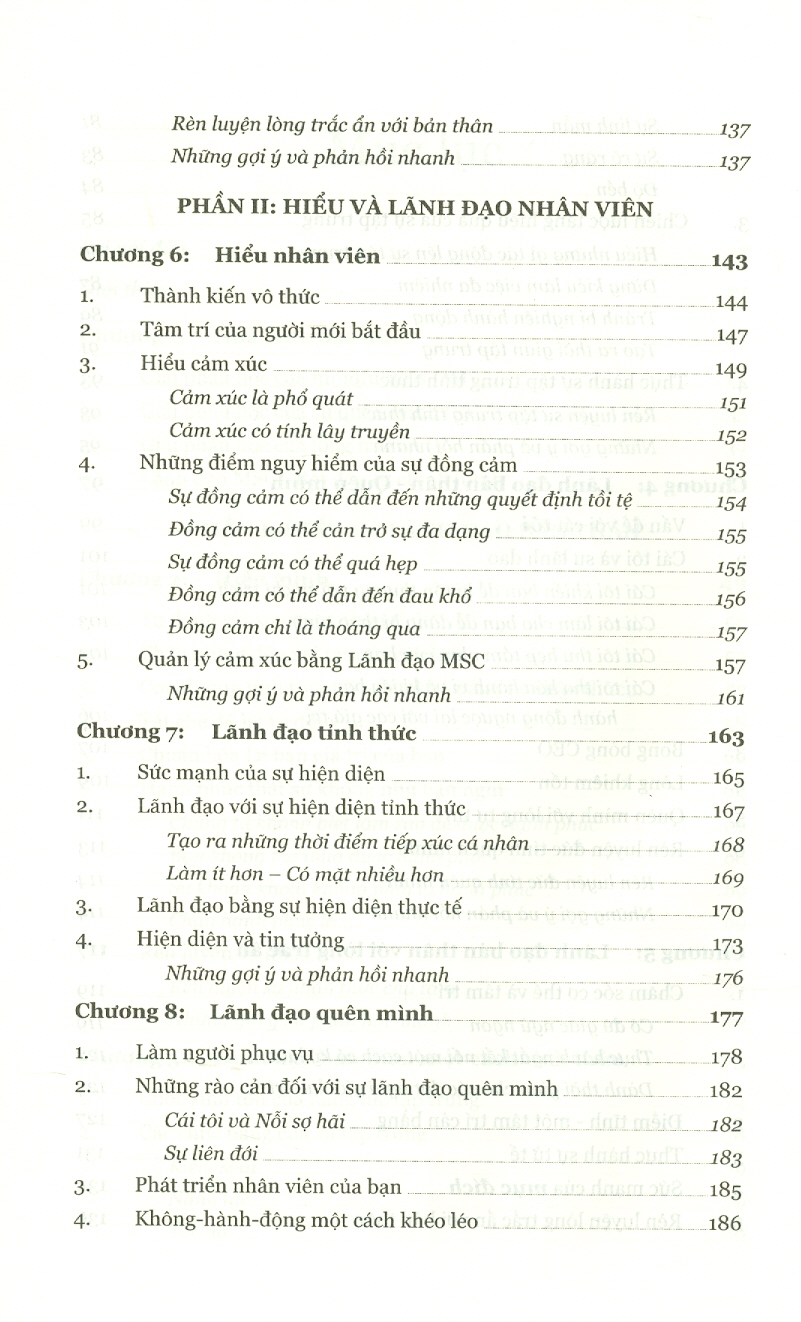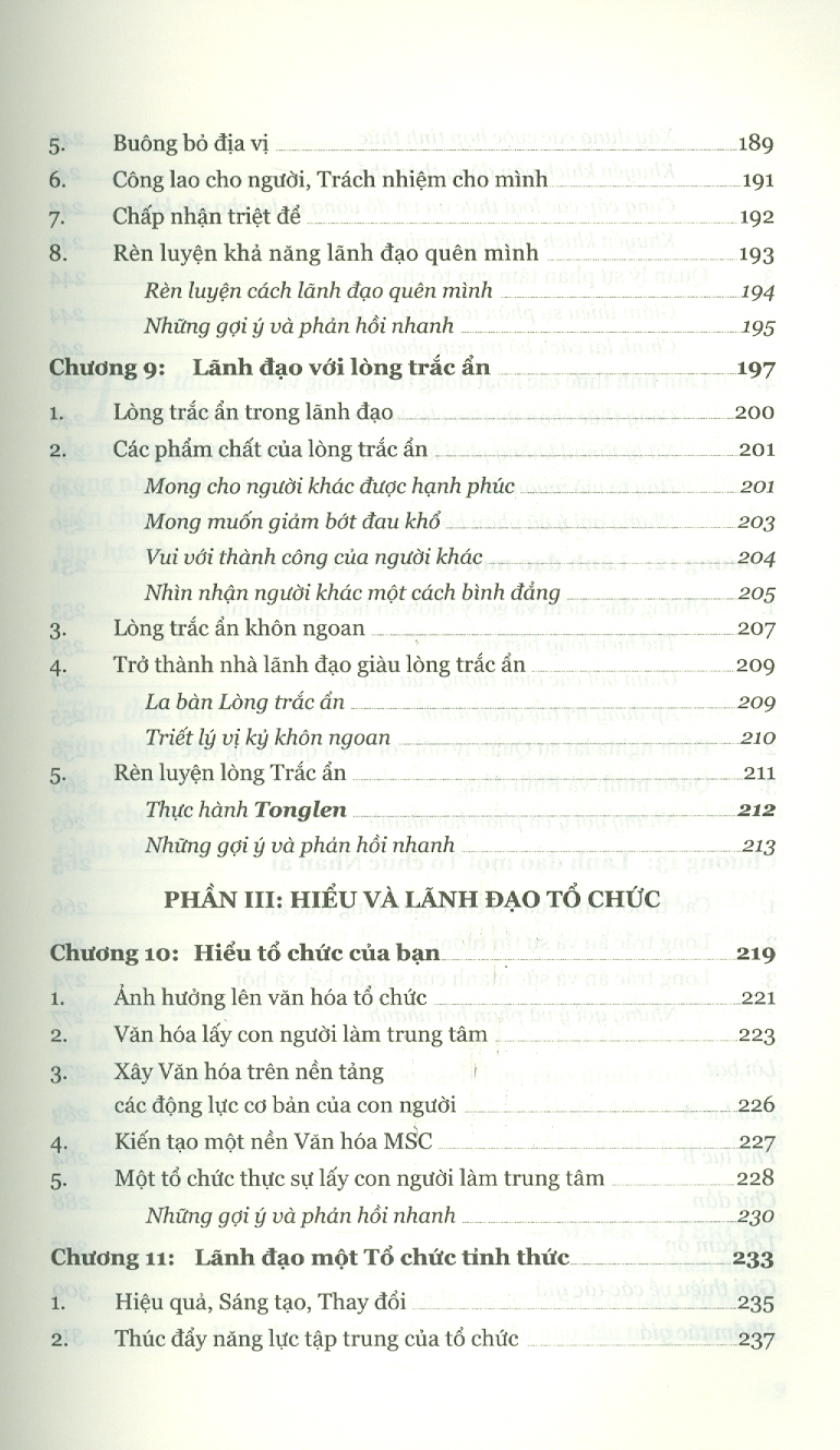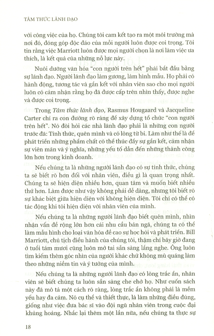 Cuốn sách “Tâm thức lãnh đạo” của Rasmus Hougaard và Jacqueline Carter cho chúng ta cách để thực hiện điều đó. Nó đưa ra những hướng dẫn cho các nhà lãnh đạo biết cách lãnh đạo bản thân, đội ngũ và tổ chức để giải phóng nguồn động lực từ bên trong, tạo ra các nền văn hóa thực sự lấy con người làm trung tâm và mang lại kết quả phi thường. Nó đòi hỏi các nhà lãnh đạo phải là những con người trước đã: Tỉnh thức, quên mình và có lòng từ bi. Làm như thế là để phát triển những phẩm chất có thể thúc đẩy sự gắn kết, cảm nhận sự viên mãn và ý nghĩa, những yếu tố dẫn đến những thành công lớn hơn trong kinh doanh.