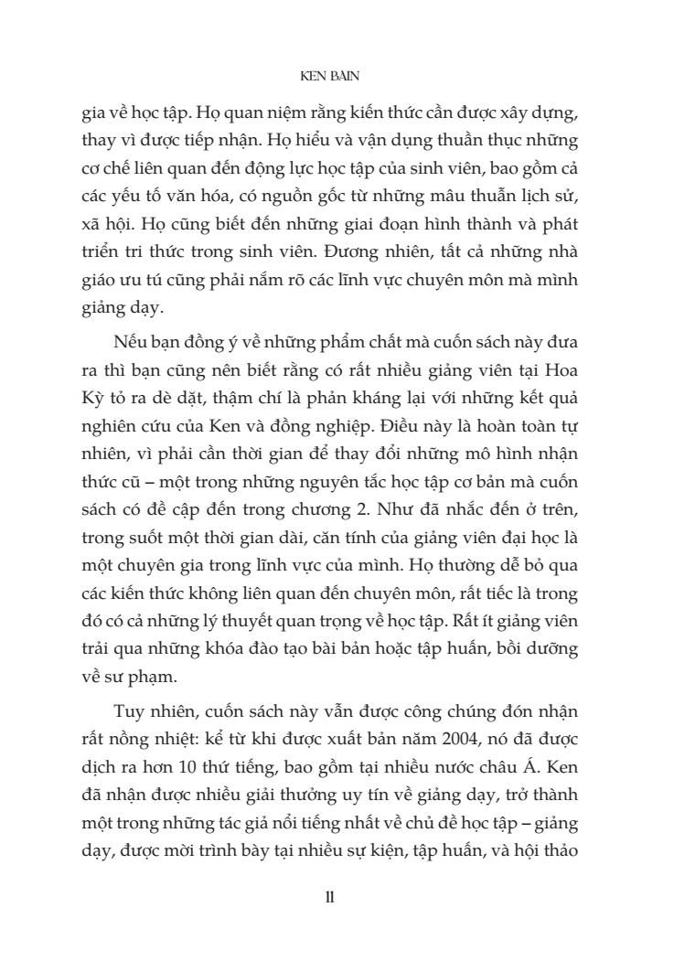 Ken Bain hiện là viện trưởng của Học viện Nhà giáo Ưu tú (Best Teachers Institute), một tổ chức nghiên cứu và giáo dục có trụ sở tại New Jersey và Washington, D.C. Ông từng là hiệu phó thường trực và hiệu phó phụ trách khối nghiên cứu tại Viện Đại học District of Columbia, cũng như thành lập các trung tâm giảng dạy tại bốn trường đại học lớn (Vanderbilt, Northwestern, NYU và Montclair State). Ken cũng là một nhà sử học với các tác phẩm chủ yếu tập trung vào lịch sử chính trị Hoa Kỳ giữa thế kỷ XX, ví dụ như The March to Zion và Last Journey Home: Killing Roosevelt. Ông đã dành nhiều thời gian để nghiên cứu về các vấn đề thuộc lĩnh vực sư phạm và đã đóng góp vào học bổng nghiên cứu trong những lĩnh vực đó. Ông đã được mời thuyết trình tại gần 500 trường đại học và sự kiện ở Hoa Kỳ, Canada, Mexico, Nam Mỹ, châu Âu, châu Á, châu Phi và Úc. Các nghiên cứu của ông tập trung vào nhiều vấn đề, bao gồm việc học sâu cũng như tạo ra môi trường học tập đề cao tư duy phản biện và diễn ra tự nhiên. Ông thường xuyên tham gia cố vấn cho các trường đại học, chính phủ và Liên minh Châu Âu.