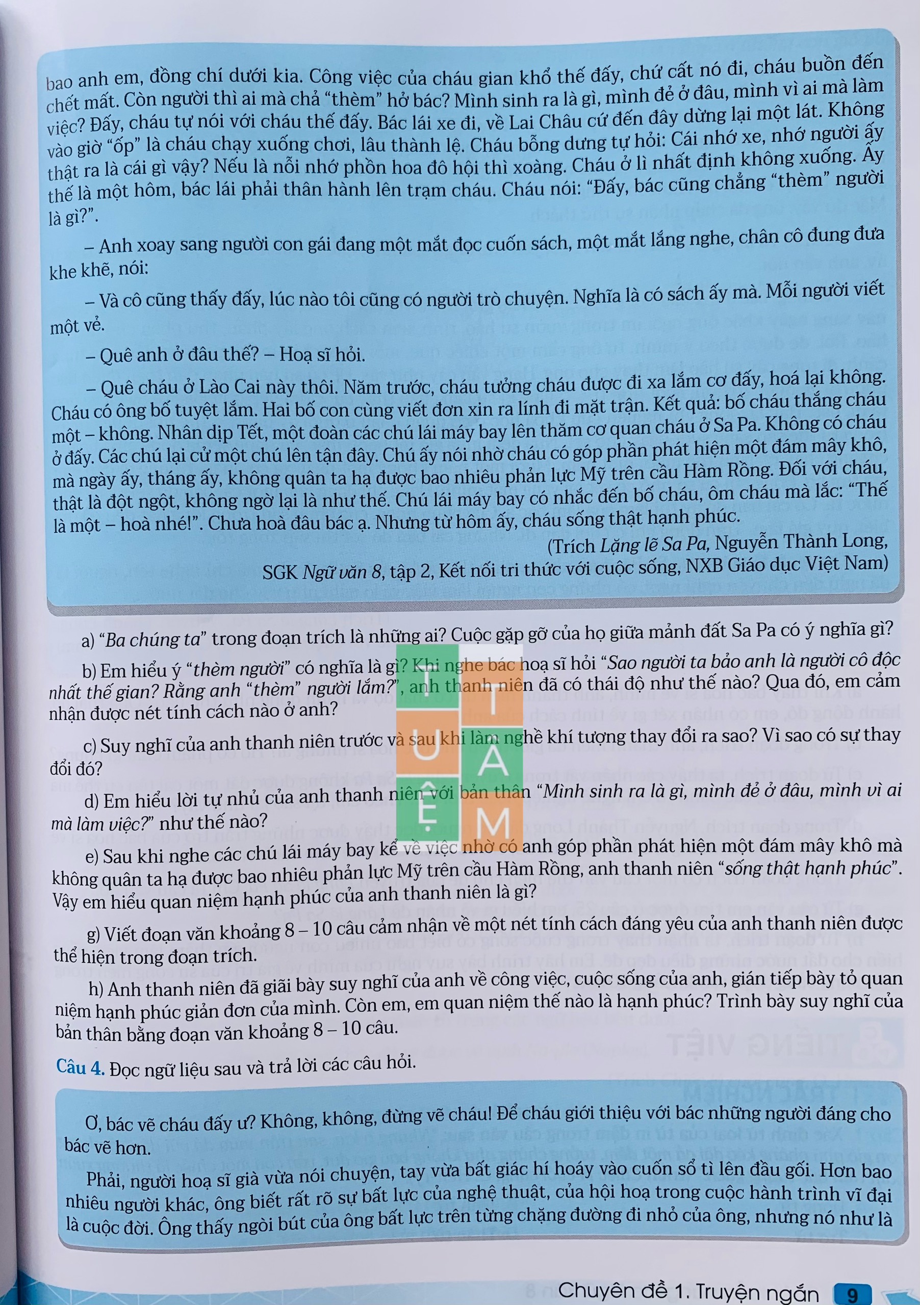 Thứ nhất, phần đọc gồm các bài tập trắc nghiệm và tự luận về các kiến thức văn bản, tiếng Việt.