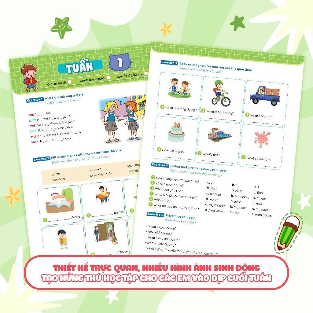- Hệ thống các bài tập phong phú, mang tính tổng hợp và ôn luyện toàn diện. Hệ thống bài tập đa dạng, lượng phù hợp với việc học cuối tuần để các con vẫn có thời gian thư giãn và vui chơi. Đặc biệt, sau mỗi kì sẽ có bài ôn tập giữa kì và cuối kì giúp con có tài liệu ôn tập cho các kì kiểm tra.