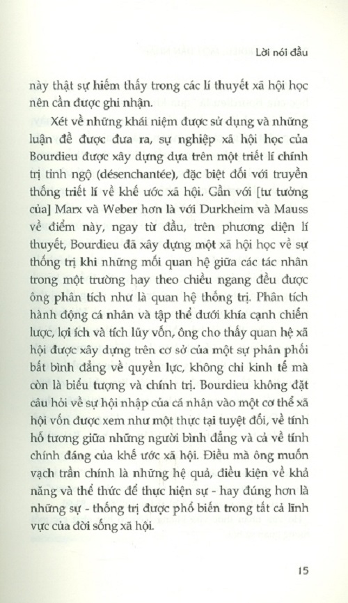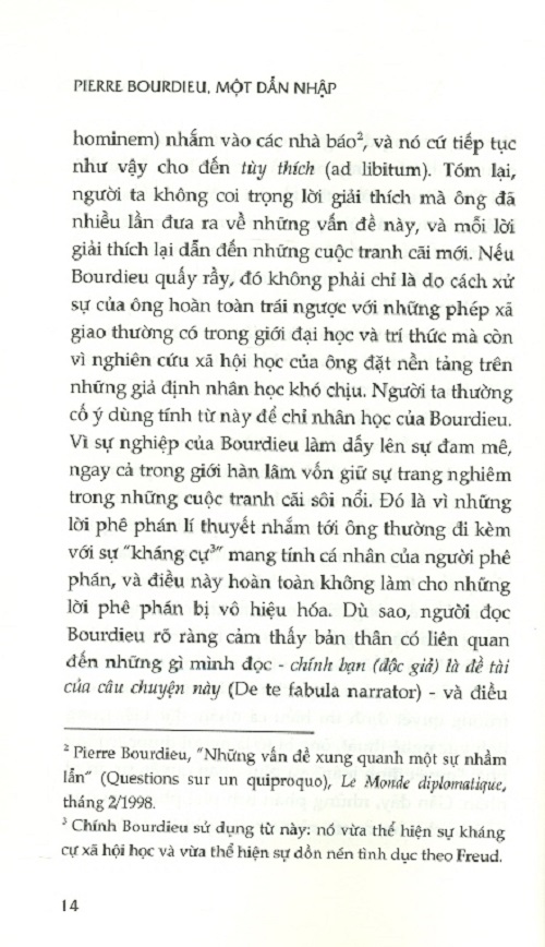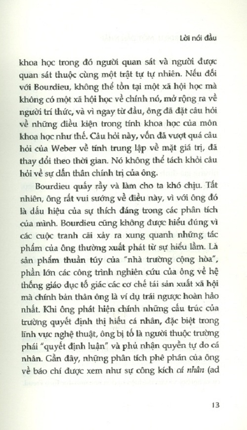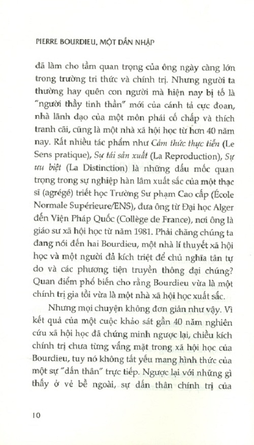 Trong bối cảnh như vậy, một dẫn nhập mang tính hệ thống về sự nghiệp kéo dài gần 40 năm là không vô ích. Với gần 30 cuốn sách (không kể các bài viết), sự nghiệp của Bourdieu có chiều kích của một công trình lớn có logic nội tại. Việc tiếp cận nó trước hết là khôi phục tiến trình hình thành, trình bày những nếp uốn nội tại, nhưng cũng cố gắng hiểu được sự tiến hóa của nó, phần nào gắn liền với việc nó được đưa vào cuộc tranh luận chính trị và tri thức mà nó đã từng đóng góp vào.