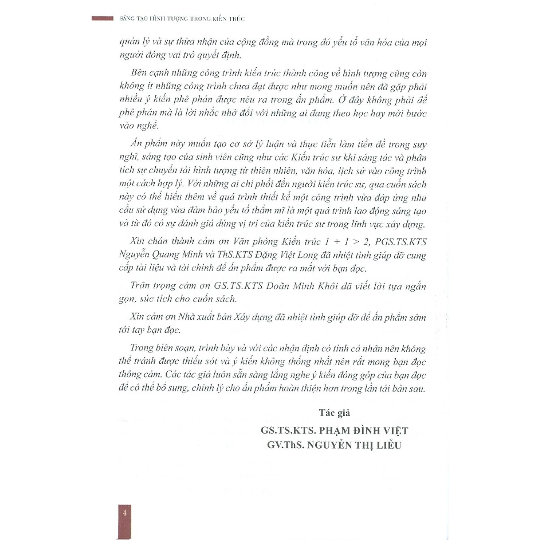 Ấn phẩm này muốn tạo cơ sở lý luận và thực tiễn làm tiền đề trong suy nghĩ, sáng tạo của sinh viên cũng như các Kiến trúc sư khi sáng tác và phân tích sự chuyển tải hình tượng từ thiên nhiên, văn hóa, lịch sử vào công trình một cách hợp lý. Với những ai chi phối đến người kiến trúc sư, qua cuốn sách này có thể hiểu thêm về quá trình thiết kế một công trình vừa đáp ứng nhu cầu sử dụng vừa đảm bảo yếu tố thẩm mĩ là một quá trình lao động sáng tạo và từ đó có sự đánh giá đúng vị trí của kiến trúc sư trong lĩnh vực xây dựng.