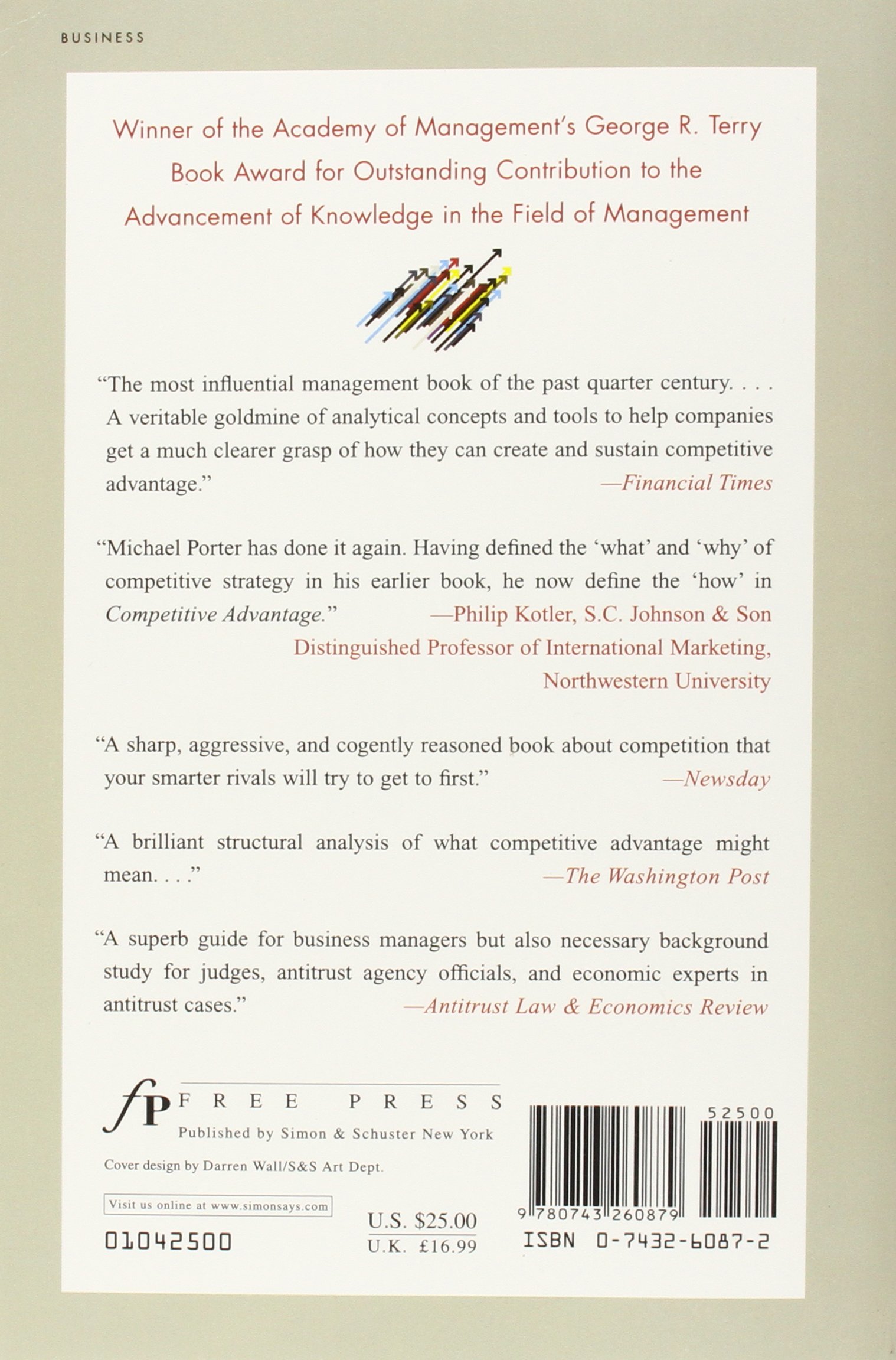 "COMPETITIVE ADVANTAGE" giới thiệu một cách hiểu hoàn toàn mới về những gì một công ty làm. Khái niệm đột phá của Porter về chuỗi giá trị phân chia một công ty thành các "hoạt động", hoặc các chức năng hoặc quy trình rời rạc đại diện cho các khối xây dựng cơ bản của lợi thế cạnh tranh. Giờ đây, là một phần thiết yếu của tư duy kinh doanh quốc tế, "COMPETITIVE ADVANTAGE" đưa chiến lược từ tầm nhìn rộng sang cấu hình hoạt động nhất quán nội bộ. Khung mạnh mẽ của nó cung cấp các công cụ để hiểu các động lực của chi phí và vị trí chi phí tương đối của một công ty. Chuỗi giá trị của Porter cho phép các nhà quản lý tách biệt các nguồn giá trị cơ bản của người mua sẽ dẫn đến mức giá cao hơn và lý do tại sao một sản phẩm hoặc dịch vụ này thay thế cho một sản phẩm hoặc dịch vụ khác. Ông cho thấy lợi thế cạnh tranh không chỉ nằm ở bản thân các hoạt động mà còn ở cách các hoạt động liên quan đến nhau, đến hoạt động của nhà cung cấp và hoạt động của khách hàng. Cụm từ 'lợi thế cạnh tranh' và 'lợi thế cạnh tranh bền vững' đã trở nên phổ biến là bằng chứng cho sức mạnh của ý tưởng của Porter. "COMPETITIVE ADVANTAGE" đã hướng dẫn vô số công ty, sinh viên trường kinh doanh và học giả hiểu được gốc rễ của cạnh tranh. Công việc của Porter đã nắm bắt được sự phức tạp bất thường của cạnh tranh theo cách làm cho chiến lược trở nên cụ thể và có thể hành động được.