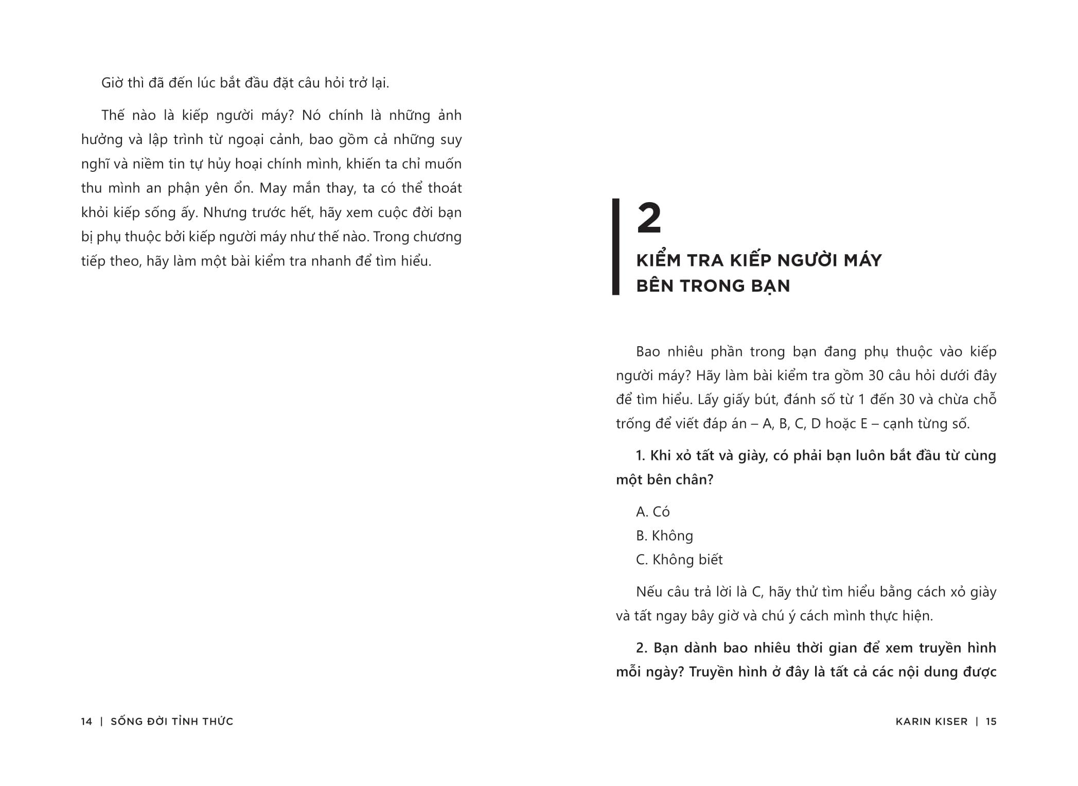 Nếu bạn đang mắc kẹt trong lối mòn, hoặc sống một cuộc sống theo thói quen, hằng ngày lặp đi lặp lại những công việc như một cái máy móc, để mỗi ngày trôi qua vô nghĩa thì bạn đang có một kiểu sống do robot điều khiển. Robot ở đây chính là tiềm thức của bạn, và bạn đang sống theo tiềm thức thay vì ý thức. Karin Kiser sẽ giúp bạn thoát khỏi con robot và sống một cuộc sống gắn kết hơn, một cuộc sống có chủ đích.
