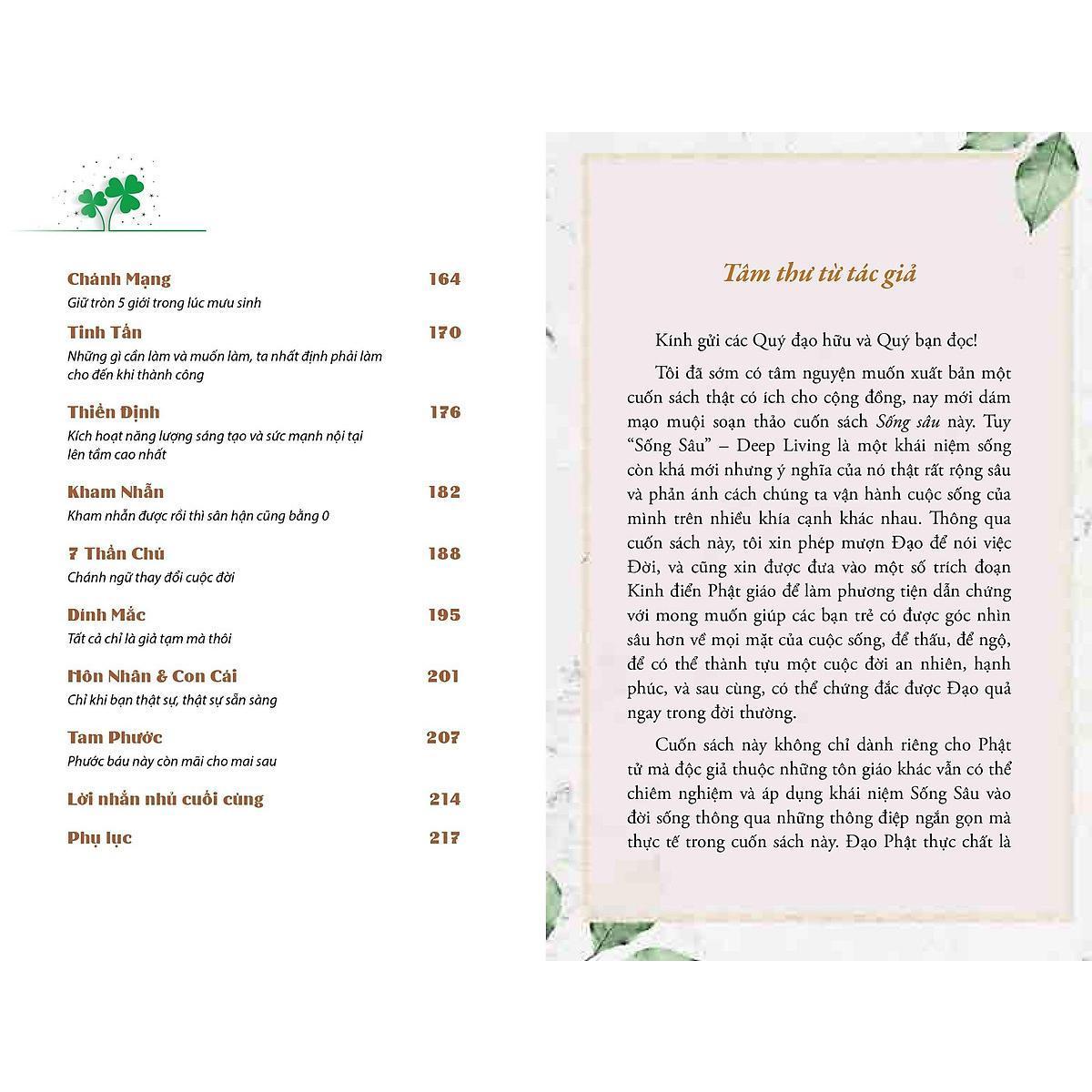 [ThaiHaBooks] Tuy “Sống Sâu” – Deep Living là một khái niệm sống còn khá mới nhưng ý nghĩa của nó thật rất rộng sâu và phản ánh cách chúng ta vận hành cuộc sống của mình trên nhiều khía cạnh khác nhau. Thông qua cuốn sách này, tác giả mượn Đạo để nói việc Đời, và cũng xin được đưa vào một số trích đoạn Kinh điển Phật giáo để làm phương tiện dẫn chứng với mong muốn giúp các bạn trẻ có được góc nhìn sâu hơn về mọi mặt của cuộc sống, để thấu, để ngộ, để có thể thành tựu một cuộc đời an nhiên, hạnh phúc, và sau cùng, có thể chứng đắc được Đạo quả ngay trong đời thường.