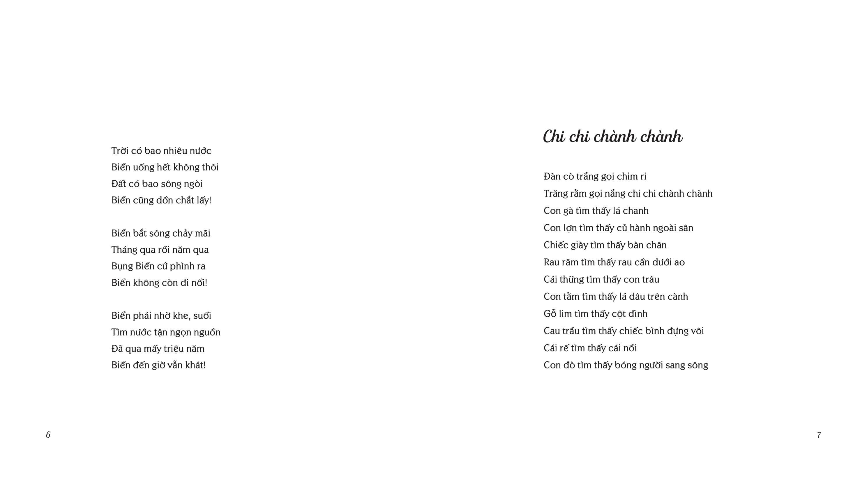 Có cậu bé biển nghịch ngợm, ăn vụng đường lại bốc nhầm muối, nên đã mấy triệu năm rồi vẫn khát; Có câu chuyện lịch sử về làng Đồng Cổ; Lại có anh dã tràng xây lâu đài cát khiến biển mê tít, cứ lượn quanh ngắm nghía mà “vỗ nghìn sóng hát”. Và có con sông mới sinh ra chỉ bé bằng sợi tóc, vượt qua bao rừng núi, bao thác ghềnh, qua mỗi nơi sông lại để lại những bến, làng, những con đê... để đến được biển thần tiên, sông đã vừa đi vừa lớn.
