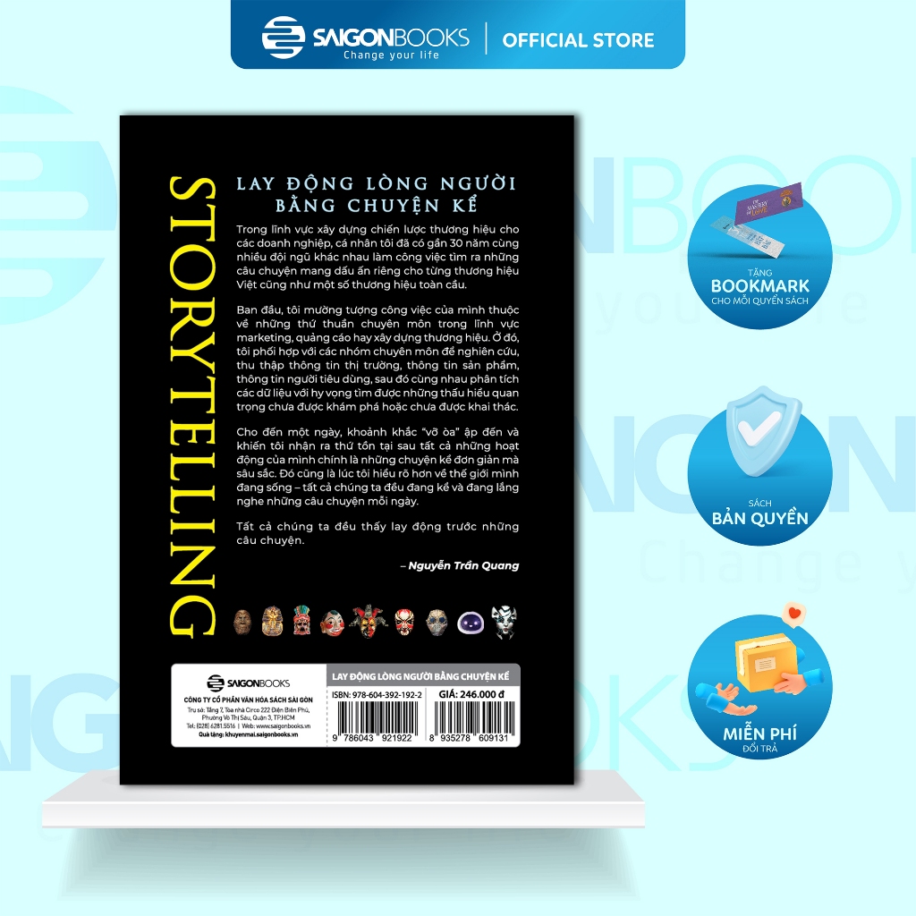 Hơn ba thập kỷ xây dựng tên tuổi vững chắc cho các thương hiệu tiếng tăm, kinh qua nhiều chức vụ lãnh đạo, cố vấn và quản lý trong các doanh nghiệp đa quốc gia, được đặt chân đến nhiều vùng đất, được nhìn - nghe - chạm và cảm thụ nhiều nền văn hóa; tác giả Trần Quang đã dành gần cả cuộc đời để quan sát, học hỏi và tìm kiếm để đọc được nhiều câu chuyện hay cũng như góp nhặt được nhiều thông tin bổ ích về cách xây dựng một câu chuyện. Và tất cả những tinh túy đã được ông đúc kết một cách cô đọng, gần gũi nhưng chẳng kém phần thú vị trong “Storytelling - Lay động lòng người bằng chuyện kể”.