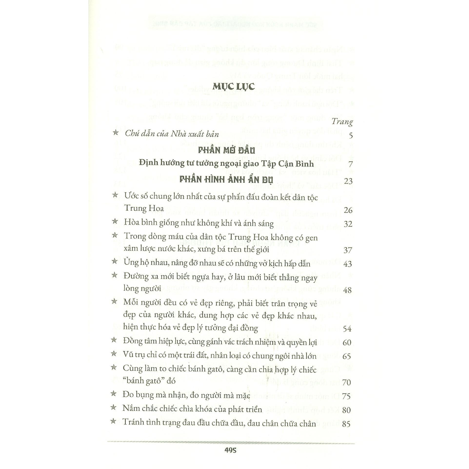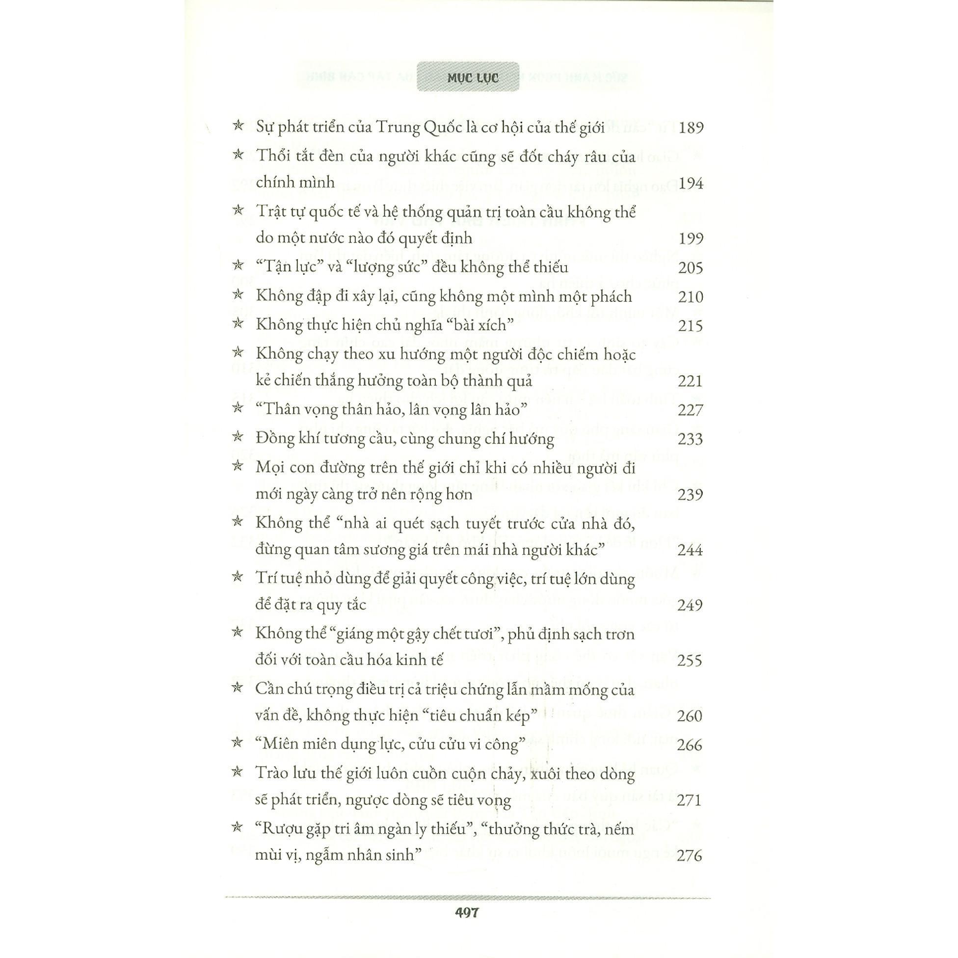 Cuốn sách gồm bốn phần: Phần mở đầu; Phần hình ảnh ẩn dụ; Phần ngôn ngữ đời thường và Phần trích dẫn thơ văn; là các bài diễn văn trước công chúng, bài trả lời phỏng vấn báo chí nước ngoài… của Tổng Bí thư, Chủ tịch Trung Quốc Tập Cận Bình, được diễn giải gắn với bố cục tổng thể đổi mới lý luận và thành tựu thực tiễn của Trung ương Đảng Cộng sản Trung Quốc kể từ Đại hội XVIII.