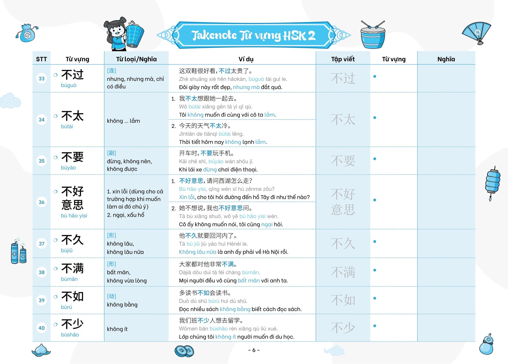 Takenote: Từ vựng HSK2 Tiếng Trung là cuốn sách học từ vựng được biên soạn theo chuẩn khung trình độ tiếng Trung 9 cấp mới của Hanban, cung cấp trọn bộ 772 từ vựng HSK2 . Mỗi từ được trình bày kèm phiên âm, từ loại, ví dụ minh họa rõ ràng và các cấu trúc câu thường dùng, giúp người học ghi nhớ từ nhanh chóng và ứng dụng hiệu quả trong giao tiếp. Sách đi kèm file nghe MP3 chuẩn giọng bản xứ cho toàn bộ từ và ví dụ, hỗ trợ luyện phát âm, tăng phản xạ nghe – nói, giúp người học xây dựng nền từ vựng vững theo từng cấp.
