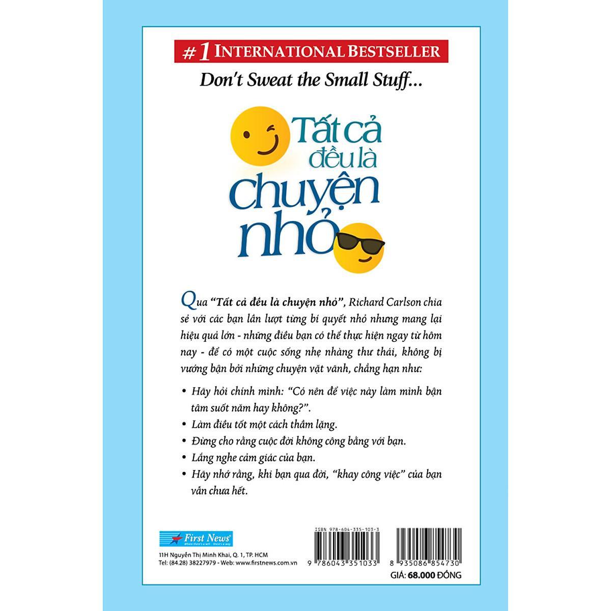 Mỗi khi đối mặt với tin xấu, một người khó chịu hay một nỗi thất vọng nào đó - đặc biệt là nghịch cảnh - hầu hết chúng ta thường có thói quen phản ứng lại cuộc sống theo những chiều hướng không mấy tốt đẹp. Và một cách đơn giản để chúng ta thay đổi cuộc sống của chính mình là thay đổi những thói quen “phản ứng” cũ bằng những thói quen nhìn nhận mới. Các thói quen này sẽ cho phép chúng ta có được cuộc sống trọn vẹn hơn sau khi đã giải quyết đủ loại vấn đề - stress, trục trặc trong các mối quan hệ, công việc, cũng như những nỗi chán nản nói chung. Được khái quát thành 81 đề mục nhỏ với những mẩu chuyện, những lời khuyên, chia sẻ hoặc dẫn chứng về nội dung đang được đề cập, cuốn sách là một cẩm nang sống tuyệt vời. Qua “Tất cả đều là chuyện nhỏ”, Richard Carlson chia sẻ với các bạn lần lượt từng bí quyết nhỏ nhưng mang lại hiệu quả lớn - những điều bạn có thể thực hiện ngay từ hôm nay - để có một cuộc sống nhẹ nhàng thư thái, không bị vướng bận bởi những chuyện vặt vãnh. Khi bạn không chấp nhặt những chuyện nhỏ, cuộc sống của bạn không phải ngay lập tức trở nên hoàn hảo, nhưng bạn sẽ học được cách chấp nhận những điều tự nhiên đang diễn ra xung quanh bạn. Nếu bạn áp dụng những bí quyết này, bạn sẽ học được hai nguyên tắc để sống một cách hòa hợp: