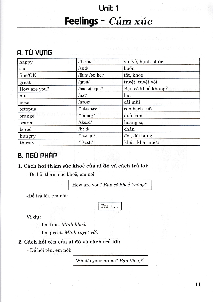 Lưu ý trước khi làm bài tập, các em nên xem qua phần từ vựng và ngữ pháp ở đầu mỗi bài. Phần này không những chú thích ý nghĩa của từng từ vựng mà còn giảng giải chi tiết cách dùng từng mẫu câu. Điều này sẽ rất có lợi cho các em bởi vì sự nắm vững kiến thức cơ bản sẽ giúp các em làm tốt tất cả các bài tập trong sách.