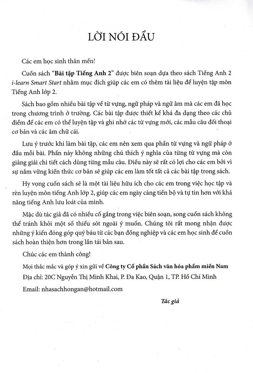 Hy vọng cuốn sách sẽ là một tài liệu hữu ích cho các em trong việc học tập và rèn luyện môn tiếng Anh lớp 2, giúp các em ngày càng tiến bộ và tự tin hơn với khả năng tiếng Anh lưu loát của mình. . Mặc dù tác giả đã có nhiều cố gắng trong việc biên soạn, song cuốn sách không thể tránh khỏi một số thiếu sót ngoài ý muốn. Chúng tôi rất mong nhận được những ý kiến đóng góp quý báu từ các bạn đồng nghiệp và các em học sinh để cuốn sách hoàn thiện hơn trong lần tái bản sau.