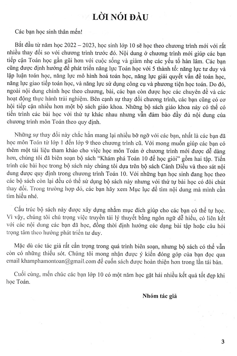 Bắt đầu từ năm học 2022 - 2023, học sinh lớp 10 sẽ học theo chương trình mới với rất nhiều thay đổi so với chương trình trước đó. Nội dung ở chương trình mới giúp các bạn tiếp cận Toán học gần gũi hơn với cuộc sống và giảm nhẹ các yếu tố hàn lâm. Các bạn cũng được định hướng để phát triển năng lực Toán học với 5 thành tố: năng lực tư duy và lập luận toán học, năng lực mô hình hóa toán học, năng lực giải quyết vấn đề toán học, năng lực giao tiếp toán học, và năng lực sử dụng công cụ và phương tiện học toán. Do đó, ngoài nội dung chính học theo chương, bài, các bạn còn được học các chuyên đề và các hoạt động thực hành trải nghiệm. Bên cạnh sự thay đổi chương trình, các bạn cũng có cơ hội tiếp cận nhiều hơn một bộ sách giáo khoa. Những bộ sách giáo khoa này có thể có tiến trình các bài học với thứ tự khác nhau nhưng vẫn đảm bảo đầy đủ nội dung của chương trình môn Toán theo quy định.