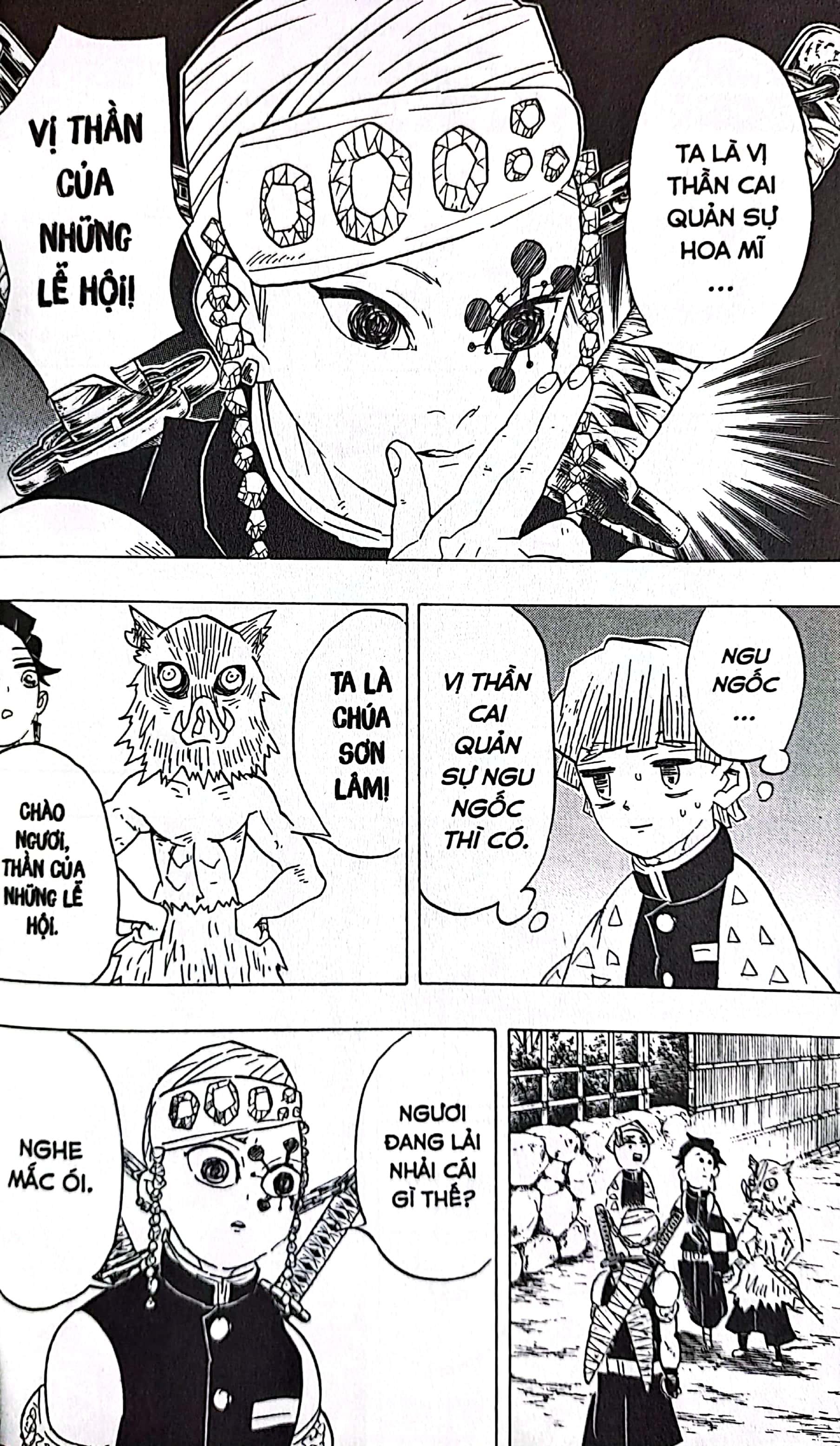 Nhóm Tanjiro cùng Âm trụ Uzui Tengen hướng đến khu phố đèn đỏ nơi quỷ cư ngụ. Tại đó, 3 người vợ ninja của Tengen đã xâm nhập để thu thập thông tin nhưng lại đột nhiên mất liên lạc. Nhóm Tanjiro phải giả gái để đột nhập vào điều tra, nhưng vẫn không tìm được nơi ẩn nấp của quỷ. Trong lúc ấy, các oiran thì bị quỷ bắt cóc!! Liệu nhóm Tanjiro có thể tìm ra con quỷ đang lẩn trốn không!?