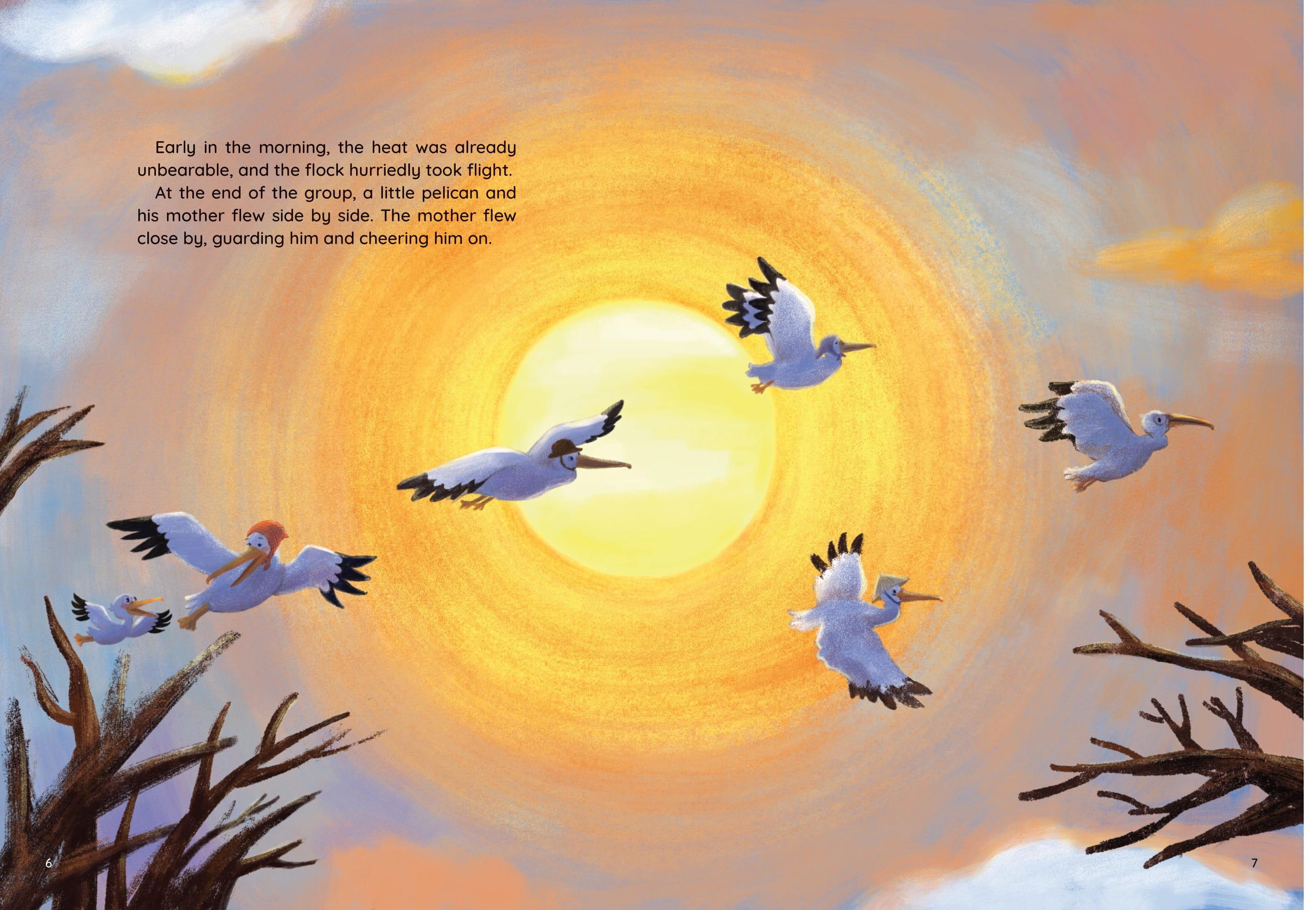 long ago, during a drought, a flock of pelicans flew together from the south to the north. among them, there were a mother pelican and her little one. they always stayed close during this long and dangerous journey. but when the mother got hurt, what could her child do?